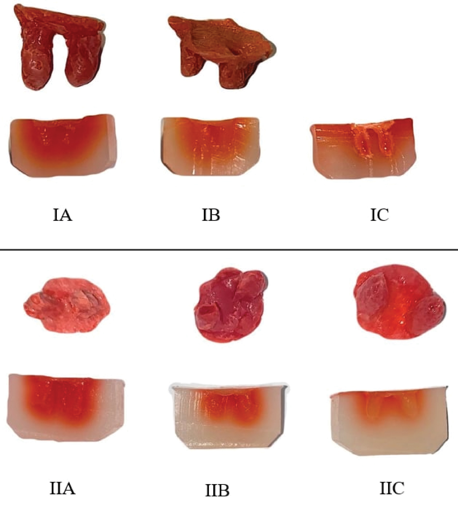 Figure 5. Formed implants and cross sections of agar blocks after their removal. IA – NMP-shellac, IB – NMP-PLGA (75:25), IC – NMP-PLGA (50:50); IIA – NMP-shellac-PEG, IIB – NMP-PLGA (75:25)-PEG, IIC – NMP-PLGA (50:50)-PEG.