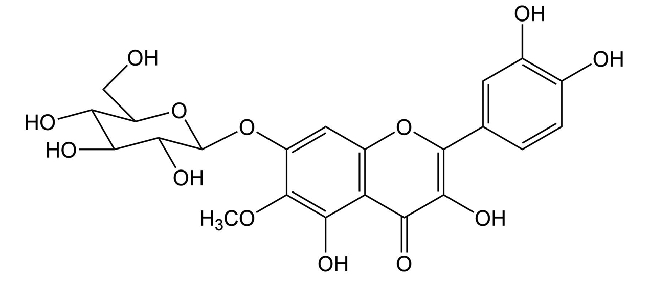 1 | Патулитрин (7-О-β-D-глюкопиранозид 3,5,7,3’,4’-пентагидрокси-6-метоксифлавона) | Кристаллическое вещество ярко-желтого цвета состава С22Н22О13 с т. пл. 250–252°С (спирт этиловый). УФ-спектр: ëmaxEtOH 266, 382 нм; + NaOAc 266, 384 нм; + NaOAc + H3BO3 272, 400 нм; +AlCl3 276, 382пл., 443 нм; +AlCl3 + HCl 275, 382пл., 438 нм; + NaOMe 303, 373, 445(пл.) нм. 1Н-ЯМР-спектр (399.78 МГц, DMSO-d6, δ, м.д., J/Гц): 12.47 (1H, с, 5-ОН-группа), 9.48 (3Н, уш. с, 3-ОН-группа, 7-ОН-группа и 4’-ОН-группа), 7.70 (1Н, д, 2.5 Гц, Н-2’), 7.52 (1Н, дд, 2.5 и 8.5 Гц, Н-6’), 6.92 (1Н, с, Н-8), 6.88 (1Н, д, 8.5 Гц, Н-5’), 5,11 (1Н, д, J = 7,12, Н-1’’ глюкопиранозы), 3,75 (3H, с, ОСН3 при С-6), 3,3-4,6 (6Н глюкопиранозы). 13С-ЯМР спектр (100.52 МГц, DМSО-d6, δС, м.д.): 176.66 (С-4), 156.89 (С-7), 151.94 (С-5), 151.58 (С-9), 148.43 (С-4’), 148.22 (С-3’), 145.49 (C-3), 135.31 (C-6’), 132.32 (С-2’), 122.39 (С-1’), 120.56 (С-6), 116.08 (С-2), 115.93 (С-5’), 104.12 (С-10), 100,64 (C-1’’ глюкозы), 94.38 (С-8), 77.75 (C-5’’ глюкозы), 77.20 (C-3’’ глюкозы), 73.72 (C-2’’ глюкозы), 70,08 (C-4’’ глюкозы), 61.15 (C-6’’ глюкозы), 60.86 (CH3O при С-6). HR-ESI-MS, 180°С, m/z: 495.1133 [M+H]+, m/z 517.0940 [M+Na]+ |