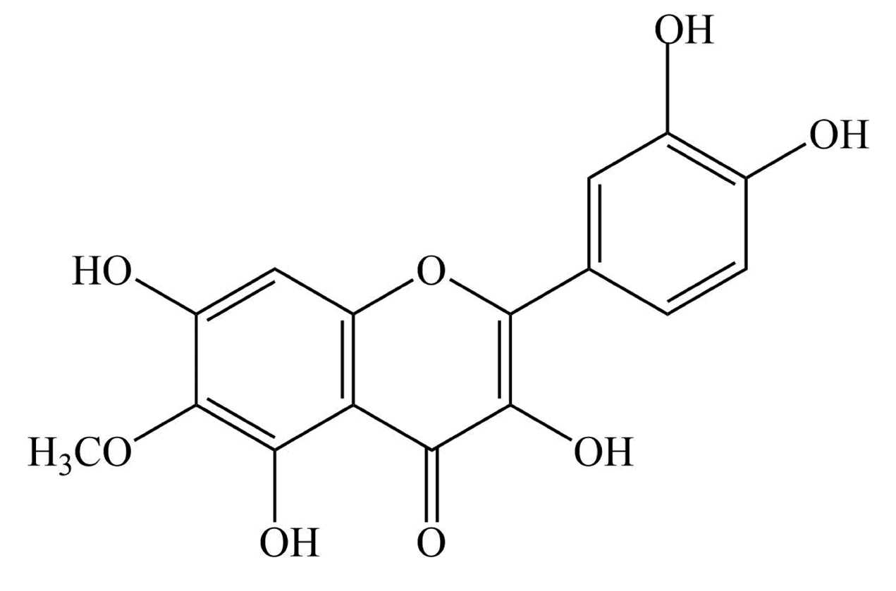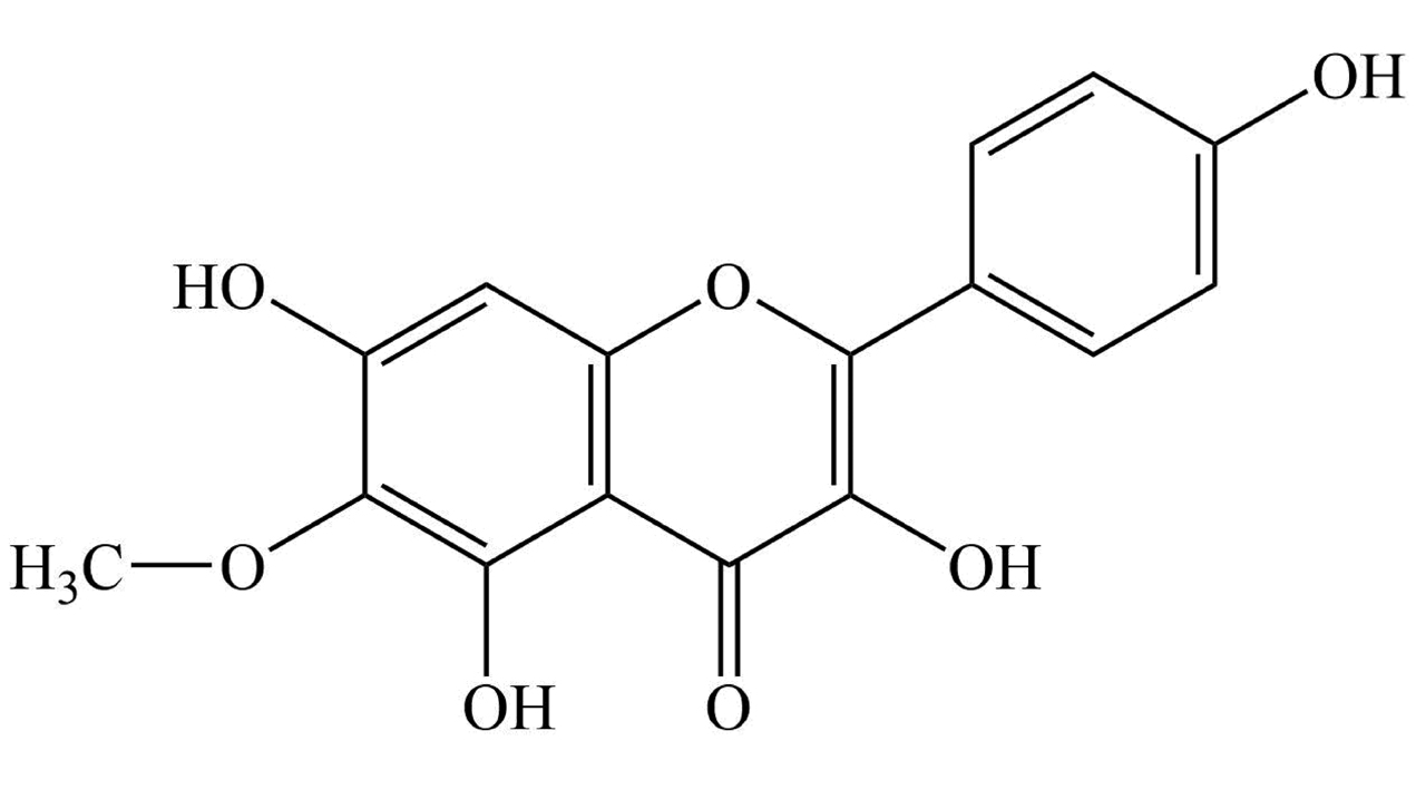 2 | Патулетин (3,5,7,3’,4’-пентагидрокси-6-метоксифлавон) | Кристаллическое вещество ярко-желтого цвета состава С16Н12О8; т.пл. 265–267°С (водный спирт). УФ-спектр: ëmaxEtOH ëmax EtOH 264, 296пл., 378 нм; +NaOAc 268, 382 +NaOAc + H3BO3 270, 396; +AlCl3 274, 381пл., 438 нм; +AlCl3 + HCl 275, 381пл., 436 нм; + NaOMe 328, 368пл.,428(пл.) нм. 1Н-ЯМР-спектр (399.78 МГц, DMSO-d6, δ, м.д., J/Гц): 12.54 (1H, с, 5-ОН-группа), 10.65 (1Н, с, 7-ОН-группа), 9.56 (1Н, с, 4’-ОН-группа), 9.32 (1Н, с, 3-ОН-группа), 7.64 (1Н, д, 2.5 Гц, Н-2’), 7.50 (1Н, дд, 2.5 и 8.5 Гц, Н-6’), 6.85 (1Н, д, 8.5 Гц, Н-5’), 6.48 (1Н, с, Н-8), 3,73 (3H, с, ОСН3 при С-6). 13С-ЯМР спектр (100.52 МГц, ДМСО-d6, δС, м.д.): 176.56 (С-4), 157.50 (С-7), 152.27 (С-5), 151.84 (С-9), 148.24 (С-4’), 147.46 (С-3’), 145.49 (C-3), 135.31 (C-6’), 132.32 (С-2’), 122.39 (С-1’), 120.56 (С-6), 116.08 (С-2), 115.93 (С-5’), 104.12 (С-10), 60.52 (CH3O при С-6). HR-ESI-MS, 180°С, m/z: 333.0605 [M+H]+, 355.0424 [M+Na]+, 371.0164 [M+К]+ |