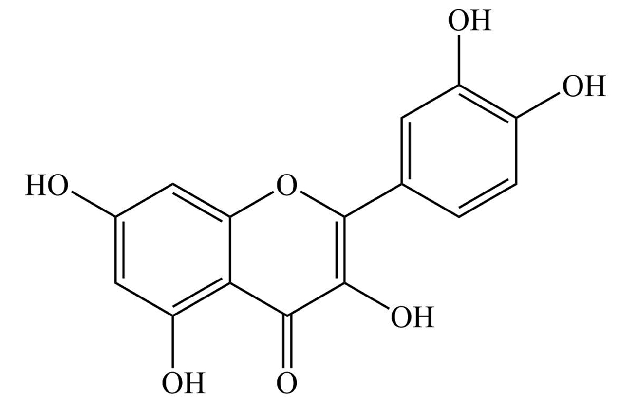 5 | Кверцетин (3,5,7,3’,4’-пентагидроксифлавон) | Ярко-желтое кристаллическое вещество состава С15Н10О7 с т.пл. 310–312°С. УФ-спектр (EtOH, ëmax, нм): 257, 268 пл, 375; + NaOAc 274, 380; +NaOAc + H3BO3 274, 398; +А1С13 270, 430; +AlCl3 + HCl 270, 410. Спектр ЯМР 1Н (399.78 МГц, DMSO-d6, δ, м.д., J/Гц): 12.45 (1H, с, 5-ОН), 10.72 (1Н, с, 7-ОН-группа), 9.54 (1Н, с, 4’-ОН-группа), 9.32 (1Н, с, 3’-ОН-группа), 9.26 (1Н, с, 3-ОН- группа), 7.64 (1Н, д, J = 2.5, Н-2’), 7.51 (дд, J = 2.5 и J = 9.0, Н-6’), 6,83 (1Н, д, J = 9.0, Н-5’), 6.37 (1Н, д, J = 2.5, Н-8), 6.15 (1Н, д, J = 2.5, Н-6) |