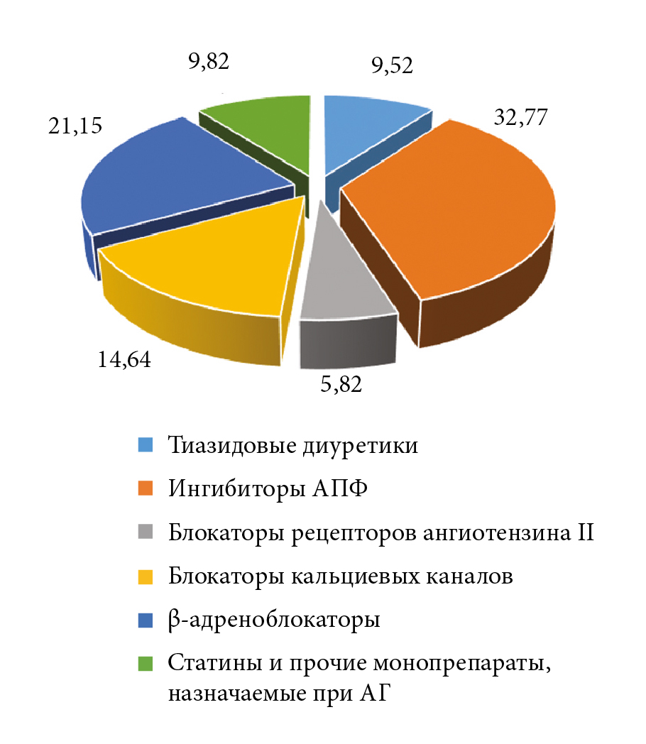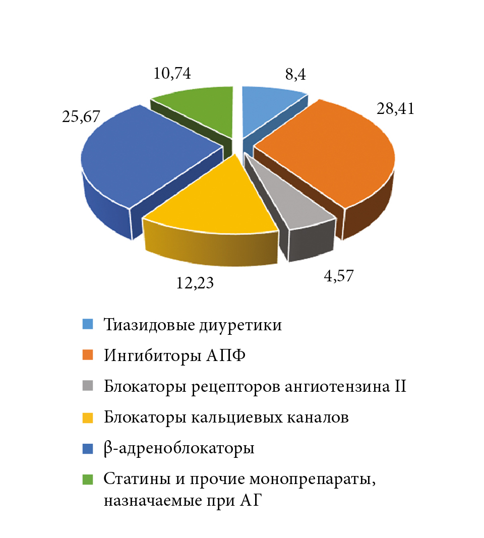 В соответствии с современными международными рекомендациями назначение фиксированных комбинаций для профилактики и лечения АГ повышает приверженность населения к фармакотерапии, что приводит к повышению эффективности лекарственной коррекции АГ. Проведенный анализ позволил установить, что доля потребления АГ ЛП в виде фиксированных комбинаций в розничном секторе фармацевтического рынка анализируемых субъектов РФ составляет от 6,28% до 9,78. Несмотря на то что в подгруппе комбинированных АГ ЛП многокомпонентные фиксированные комбинации находятся в числе лидирующих (10,22%, 8,20%, 12,10%), в общем объеме потребления ЛП данной группы на их долю приходится не более 1%, что не соответствует современным международным рекомендациям.