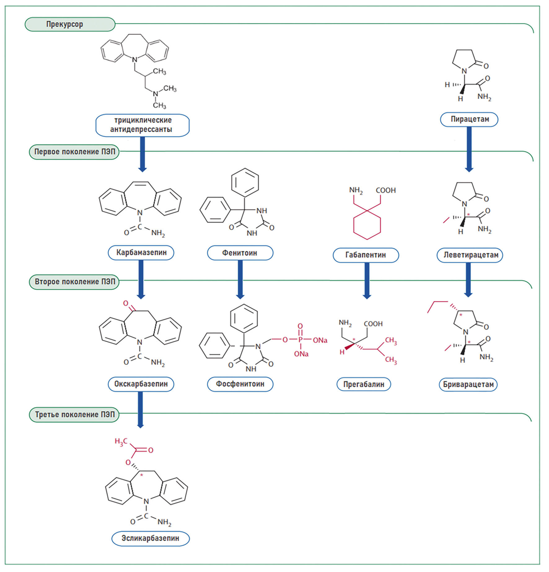 Рисунок 1. Примеры прогресса в химическом строении при разработке противоэпилептических препаратов [16, 17].