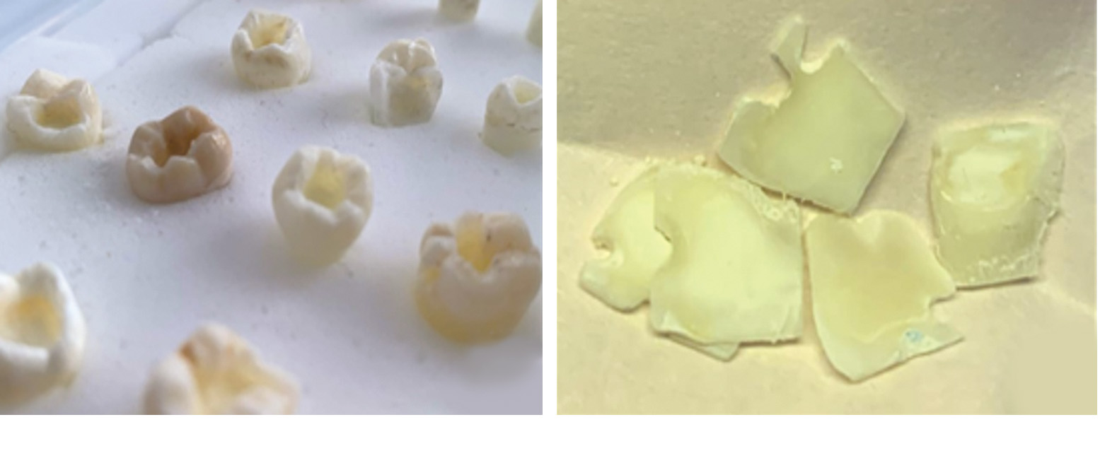 Рисунок 1. Экспериментальная лабораторная модель (А), спилы зубов с кариозными полостями (В).