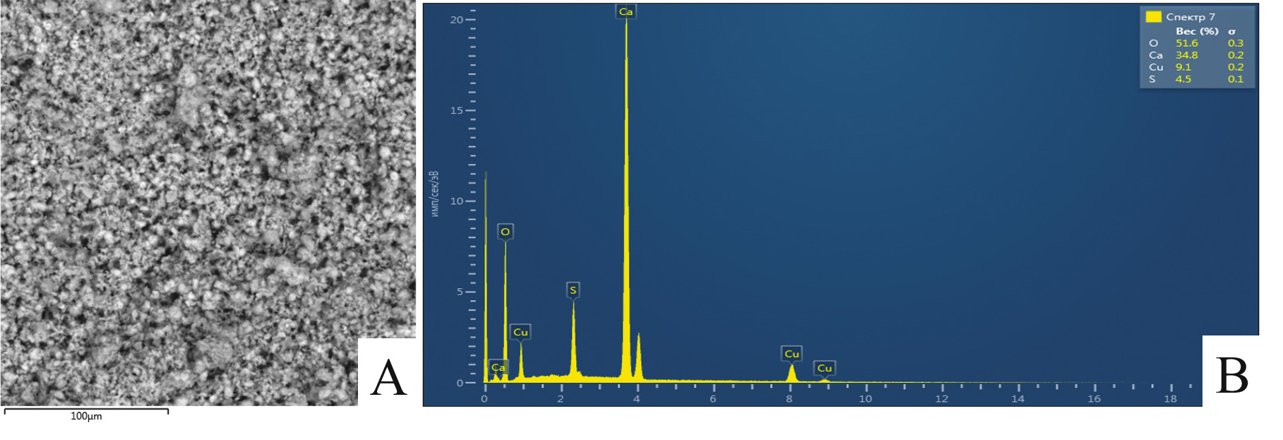 Рисунок 2. Результаты просвечивающей электронной микроскопии (А) и рентгенофлуоресцентного элементного анализа (В) препарата «Купрал»®.