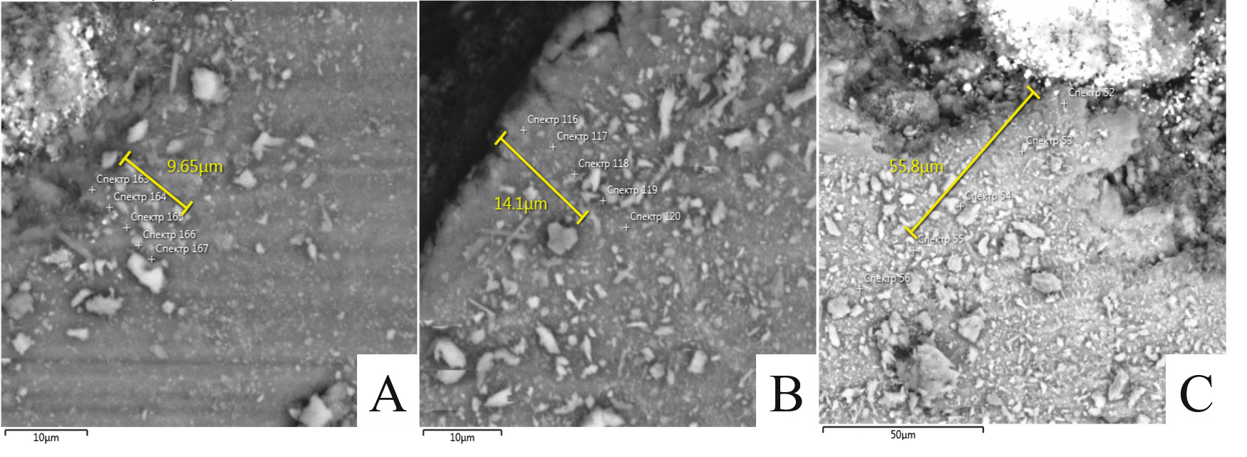 Рисунок 3. Примеры электронных микрофотографий спилов зубов после проведения процедур гальванофореза препарата «Купрал»® в течение А – одних суток, В – 14 суток, С – 30 суток.