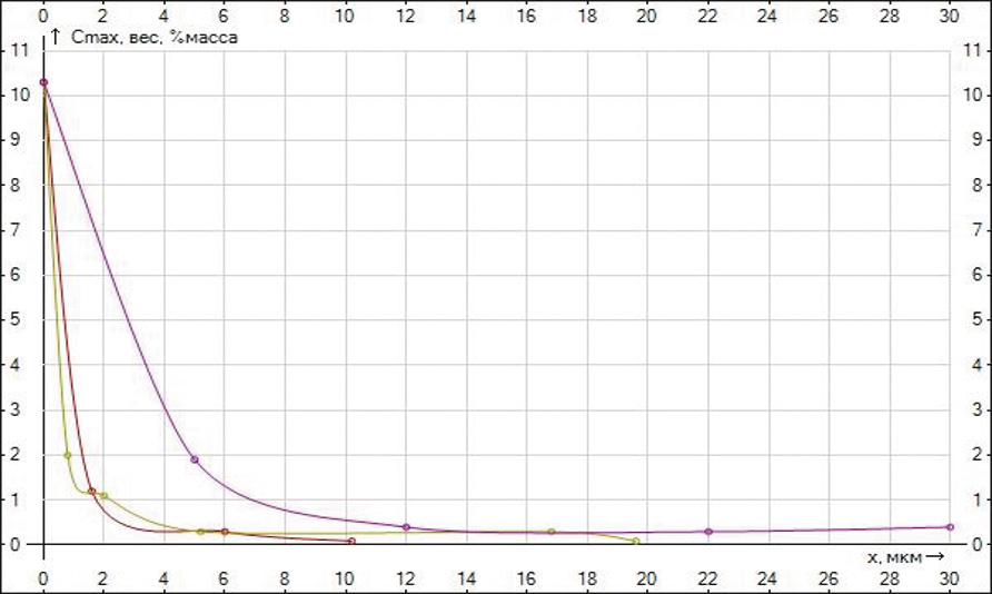 При проведении гальванофореза пасты «Купрал»® в течение 14 суток максимальная концентрация высокодисперсных частиц, содержащих медь, (2,0%) была зарегистрирована на глубине 0,4±0,04 мкм, а наиболее отдаленная точка проникновения при концентрации 0,3% была зафиксирована на глубине 19,3±0,27 мкм (рисунок 3В). Коэффициент диффузии (D) составил 4,4±0,05 мкм2/сутки, скорость диффузии (õ) – 1,4±0,07 мкм/сутки.