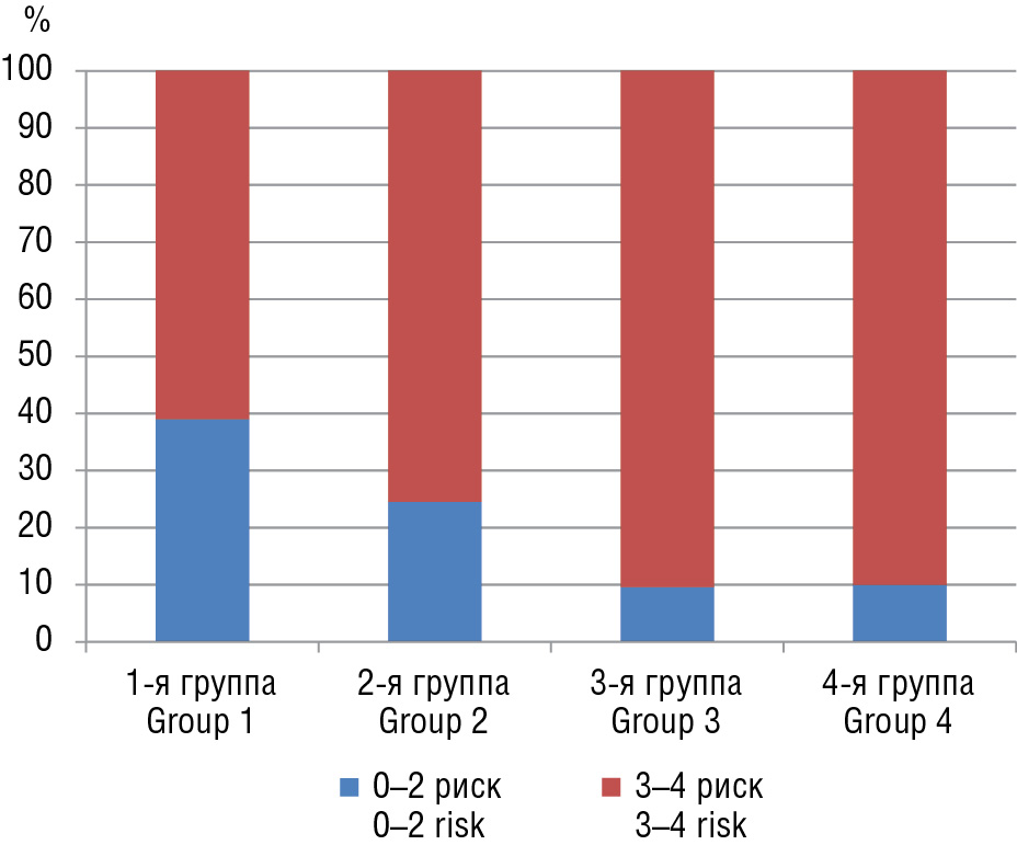Показатель | 1-я группа (n = 41), % | 2-я группа (n = 37), % | 3-я группа (n = 45), % | 4-я группа (n = 38), % | |