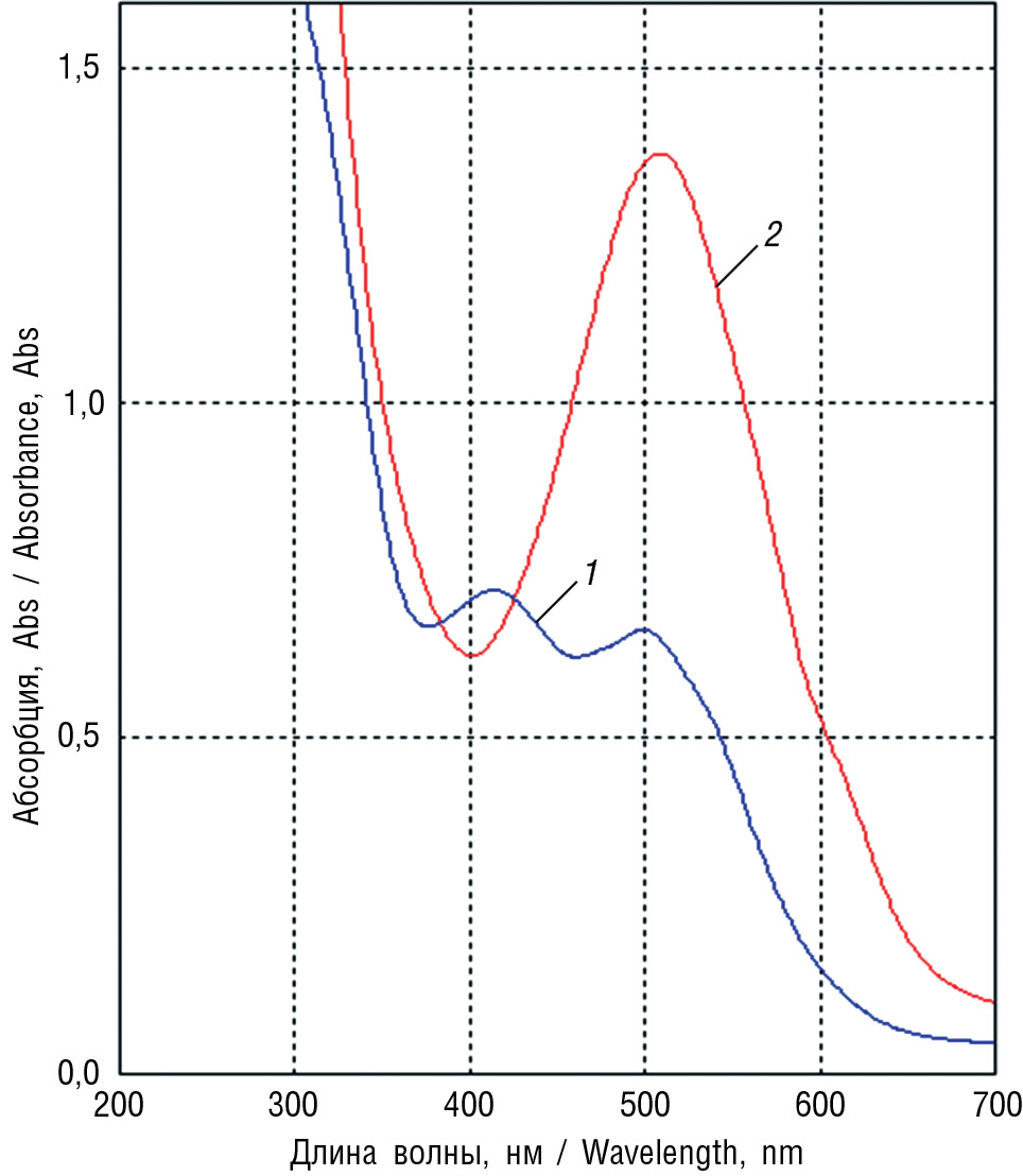 Рис. 1. Электронные спектры исходного раствора (1) и щелочно-аммиачного раствора (2) водно-спиртового извлечения из корневищ и корней марены красильной