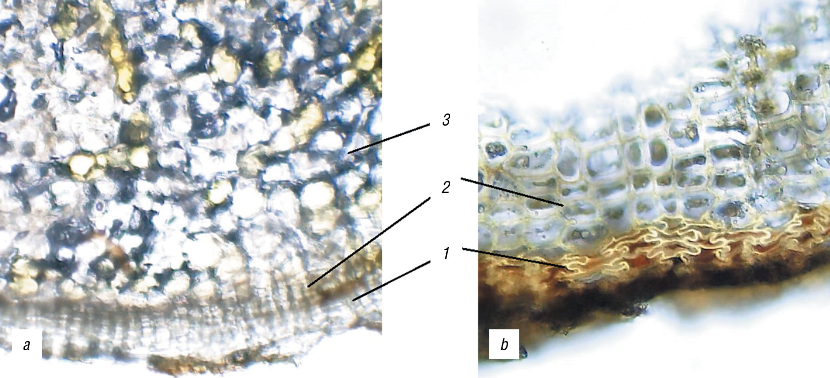 Рис. 1. Поперечный срез корня ревеня тангутского (Rheum palmatum L.): a — (×100), b — (×400). Обозначения: 1 — пробка; 2 — феллодерма; 3 — паренхима коры