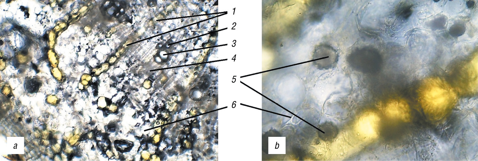 Рис. 2. Поперечный срез корня ревеня тангутского (Rheum palmatum L.): a — (×100), b — (×400). Обозначения: 1 — сердцевинные лучи; 2 — сосуды ксилемы; 3 — вторичная ксилема; 4 — камбий; 5 — друзы; 6 — первичная паренхима