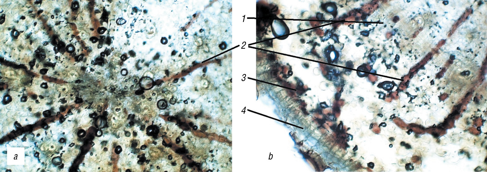 Рис. 3. Поперечный срез корня ревеня тангутского (Rheum palmatum L.): a — (×100), b — (×400). Обозначения: 1 — камбий; 2 — сердцевинные лучи; 3 — феллодерма; 4 — пробка