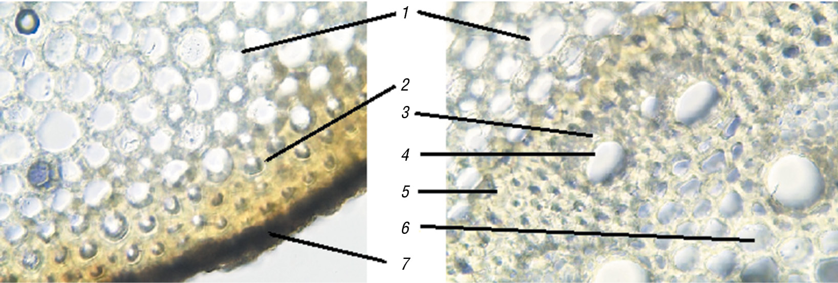 Fig. 4. Cross-section of root of Rheum officinale (×400). Designation: 1 — parenchyma of the primary cortex; 2 — exoderm; 3 — phloem; 4 — xylem; 5 — endoderm; 6 — parenchyma of the secondary cortex; 7 — stopper