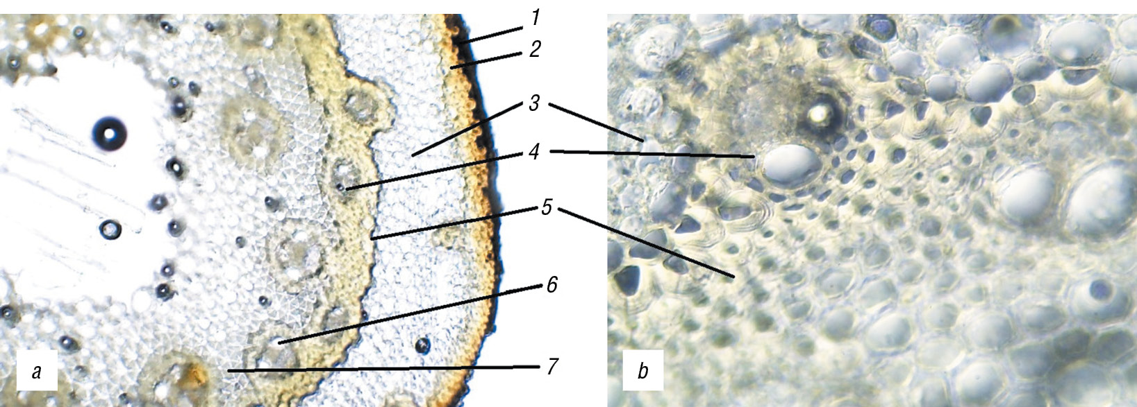 Fig. 5. A cross-section of the root of Rheum officinale: a — (×100); b — (×400). Designations: 1 — cork; 2 — phelloderm; 3 — parenchyma of the primary cortex; 4 — closed collateral bundle; 5 — endoderm; 6 — secondary xylem; 7 — parenchyma of the secondary cortex