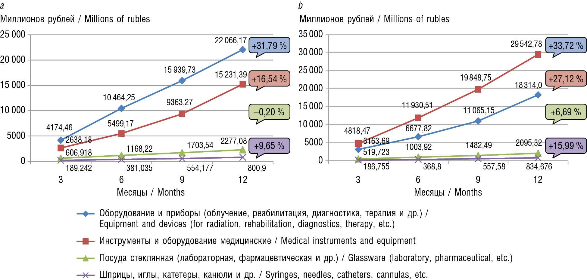 Рис. 1. Динамика роста объемов выпуска медицинских изделий в 2017 (a) и 2018 (b) годах