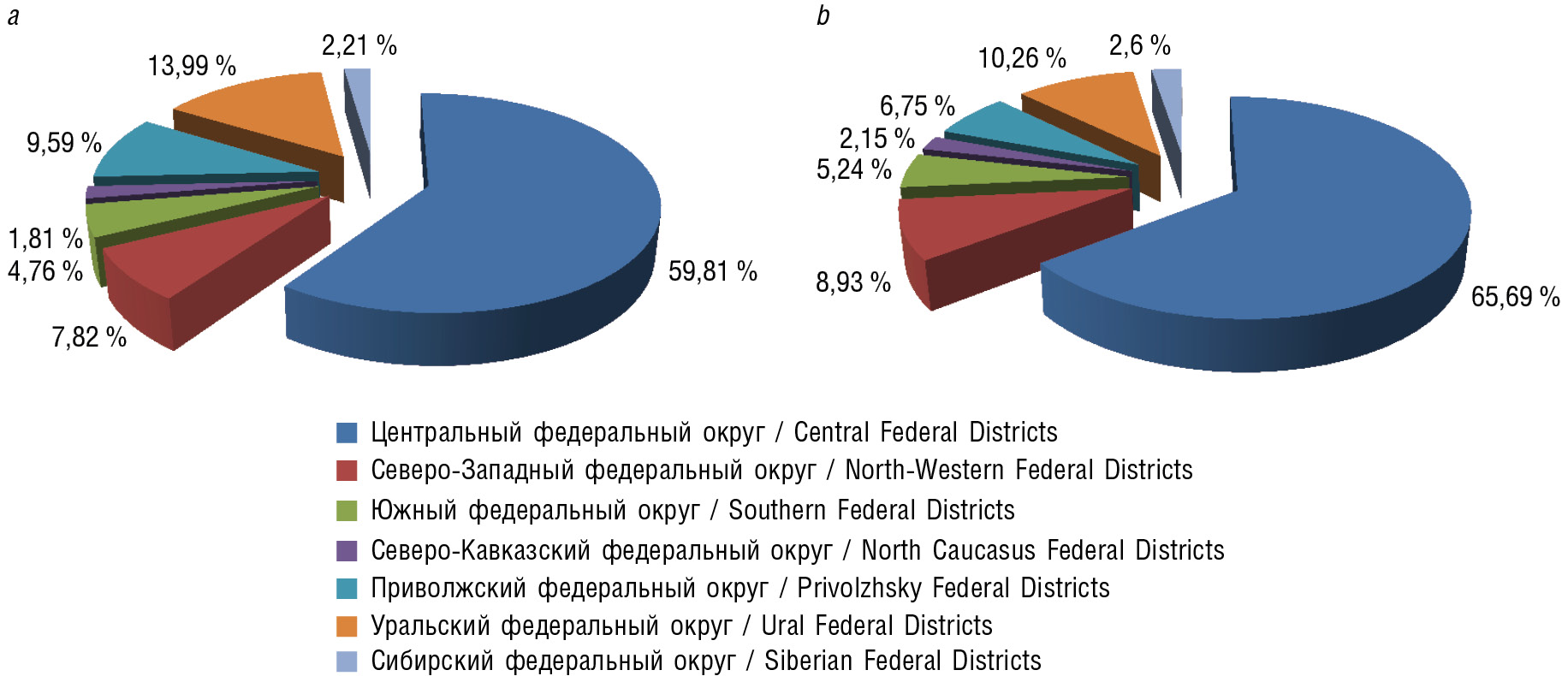 Рис. 2. Структура объемов выпуска медицинских изделий в разрезе федеральных округов в 2017 (a) и 2018 (b) годах