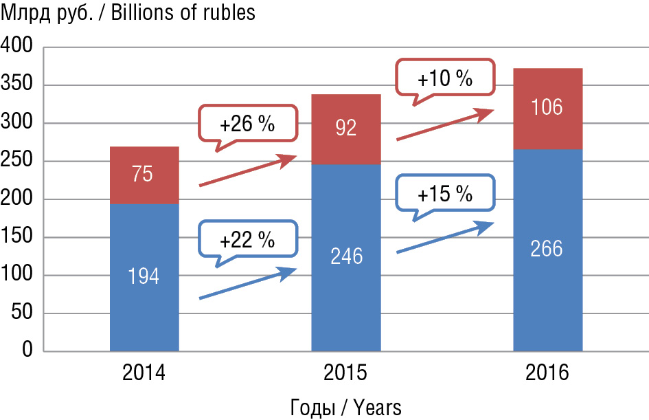 По данным агентства промышленного развития города Москвы (источник: Vademec по данным MDPro), в 2016 г. объем госпитальных закупок МИ составил 266 млрд рублей, а коммерческий сегмент — только 106 млрд рублей (рис. 3).