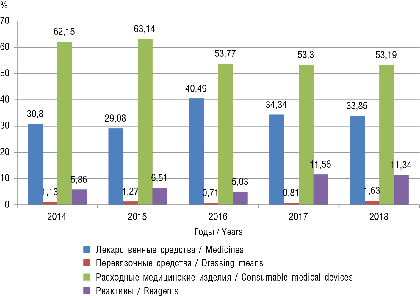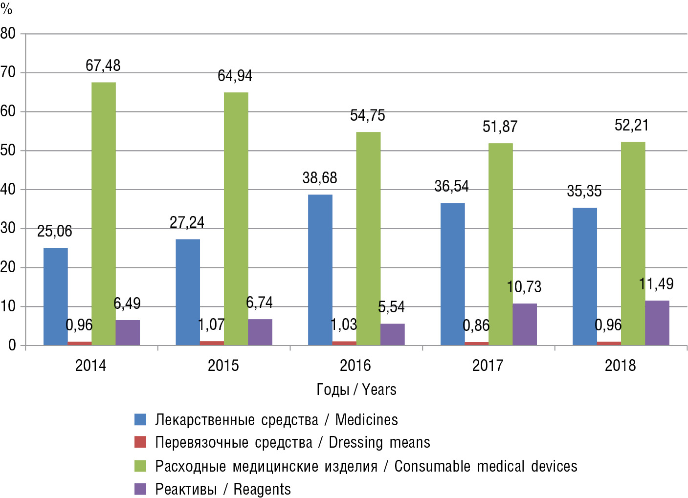За период 2014–2018 гг. на 5 % возросло использование МИ, входящих в группу «Реактивы», что связано не столько с ростом числа проводимых анализов, сколько с ростом цен на МИ, входящие в эту группу и относящиеся преимущественно к МИ зарубежного происхождения.