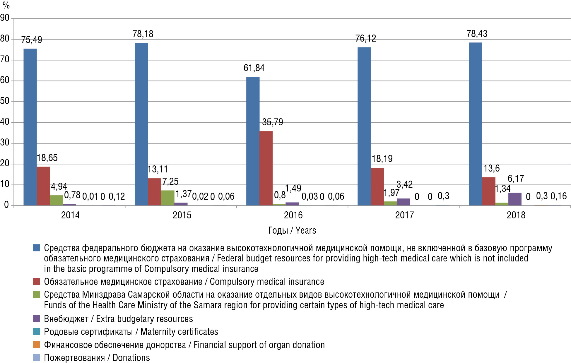 Закупка МИ осуществляется преимущественно за счет средств государственного задания на оказание высокотехнологичной МП. В 2014 г. на 75,49 % МИ были приобретены за счет указанного источника финансирования, в 2018 г. — на 78,43 % (рис. 6).