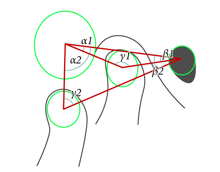 Рисунок 2. Схема изучения соотношения костных элементов ВНЧС с построением углов α1, β1, γ1 (закрытый рот), α2, β2, γ2 (открытый рот)