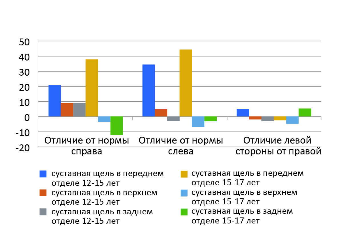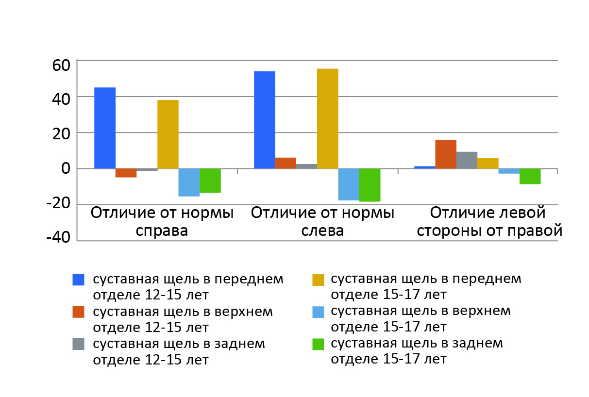 Рисунок 3. Отличие (в %) размеров суставной щели ВНЧС справа и слева у пациентов 12–17 лет со II классом 1 подклассом от показателей пациентов того же возраста с физиологической окклюзией (100%)