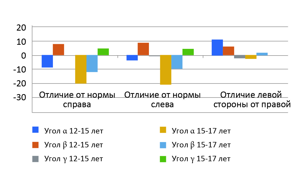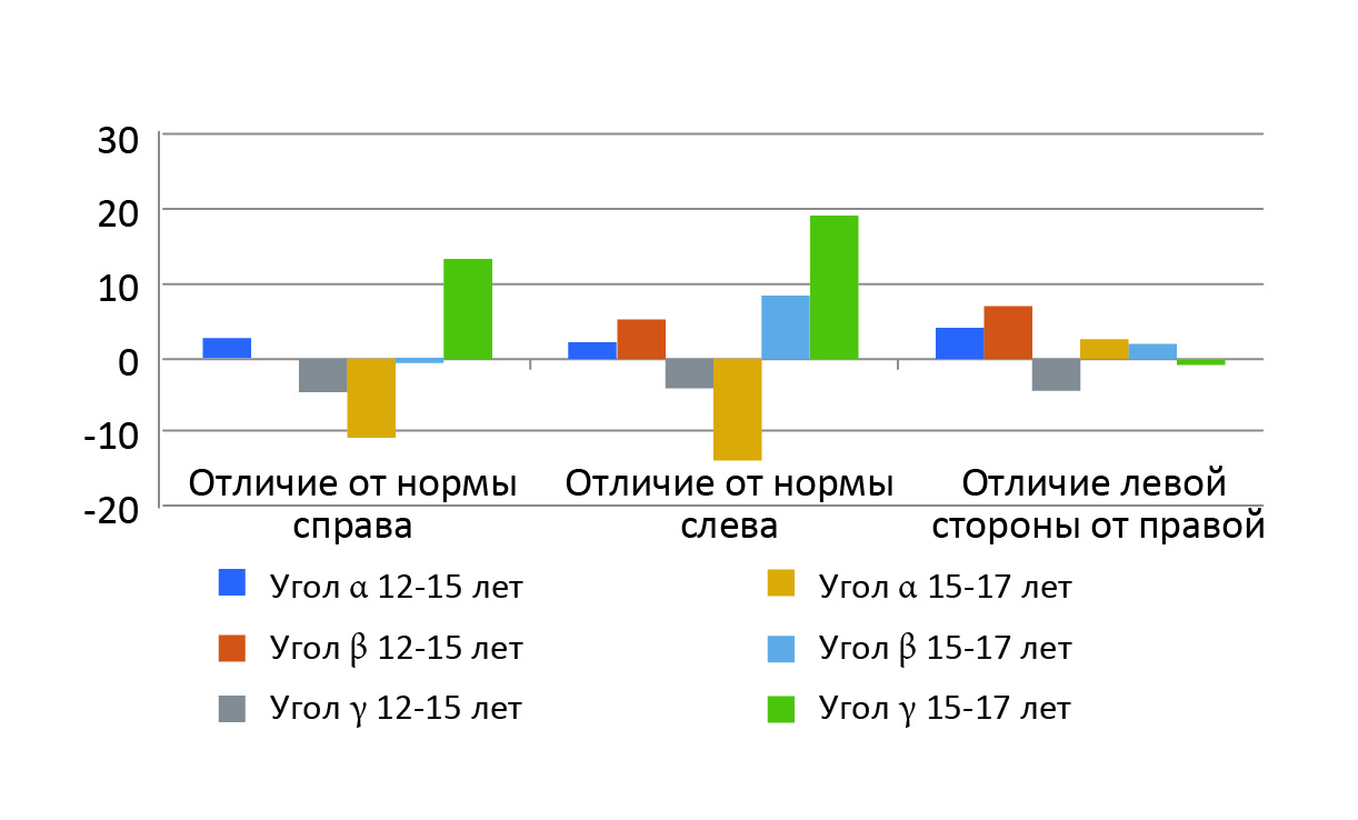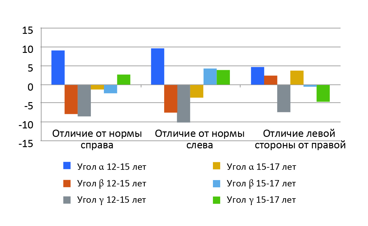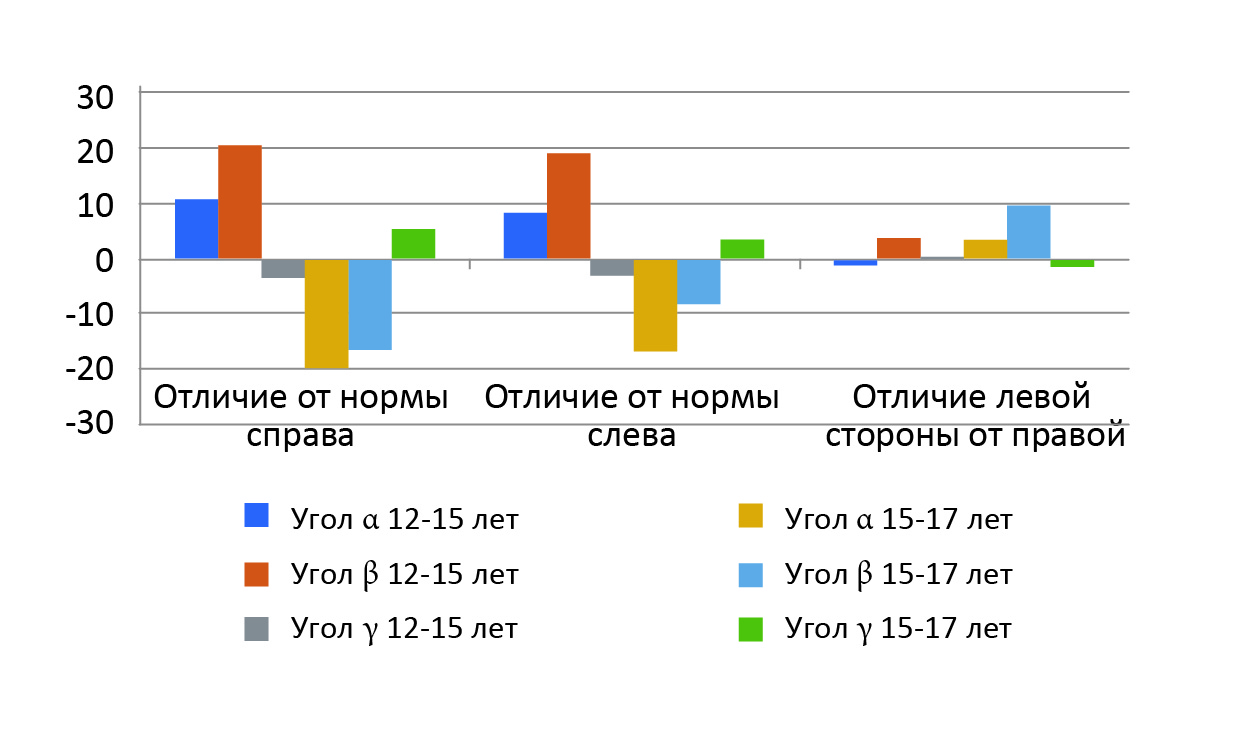 У пациентов со II классом 2 подклассом в возрастной группе 15–17 лет значение угла α меньше с обеих сторон, чем у пациентов с ФО, и составляет справа – 16,47±1,02°, слева – 16,03±0,86° (P=0,016 и P=0,011 соответственно), угол γ увеличен справа (P=0,047) и равен 145,46±2,20° (рисунок 6).