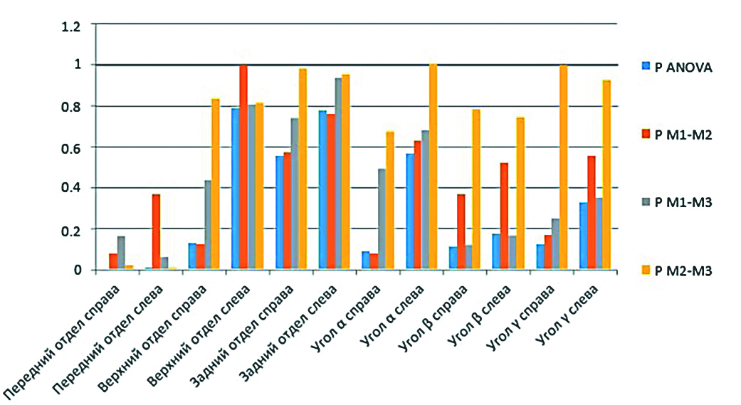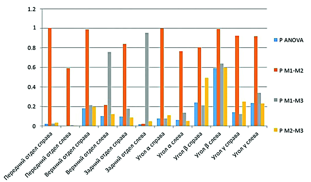 Рисунок 10. Сравнение размеров суставной щели и значений углов α, β, γ ВНЧС между подгруппами пациентов 15–17 лет со II классом 1 подклассом (М1), II классом 2 подклассом (М2), а также пациентов с ФО (M3)