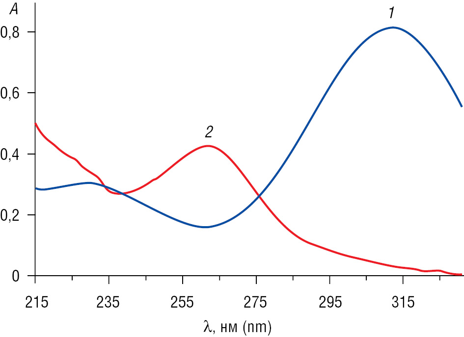 Рис. 1. УФ-спектры поглощения метронидазола (1 – С = 1,0 · 10–4 моль/л) и итраконазола (2 – С = = 2,0 · 10–5 моль/л) в этаноле / Fig. 1. UV absorption spectra of metronidazole (1 – С = 1.0 · 10–4 mol/l) and itraconazole (2 – С = = 2.0 · 10–5 mol/l) in ethanol