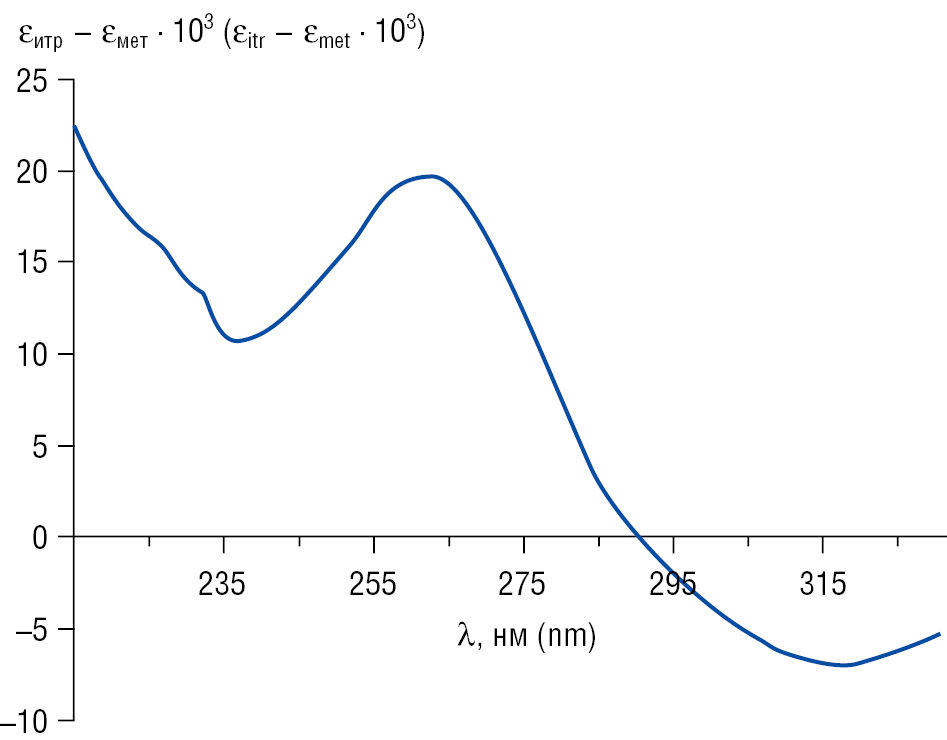 При выполнении метода нами измерены оптические плотности растворов исследуемых веществ при двух аналитических длинах волн, рассчитаны молярные показатели поглощения и составлена система уравнений. Для выбора аналитических длин волн при количественном определении исследуемых лекарственных препаратов в смеси спектрофотометрическим методом строили кривую εитр – εмет = f (λ) (рис. 2). Максимум и минимум на кривой соответствует аналитическим длинам волн.
