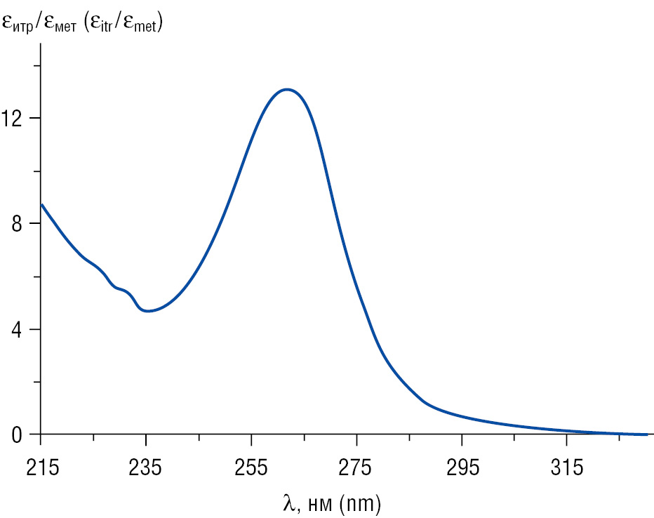 В подтверждение результатов исследований, приведенных на рис. 2, нами построена кривая в координатах εитрмет – λ нм (рис. 3), где также имеется экстремальная точка при 261–262 нм. Поэтому за аналитические длины волн в спектрофотометрическом анализе метронидазола и итраконазола в смеси нами приняты λ = 262 нм и λ = 312 нм, соответствующие максимумам в спектрах итраконазола и метронидазола.