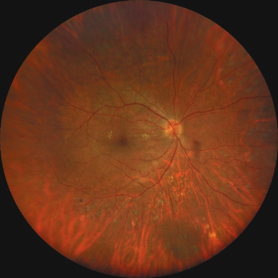 Status oculorum OU: при биомикроскопии передний отрезок и придаточный аппарат обоих глаз без особенностей. В стекловидном теле частичный организовавшийся гемофтальм. На глазном дне: диск зрительного нерва бледно-розовый, границы четкие, артерии сужены, вены расширены, в просвете верхней ветви центральной вены сетчатки и ее ветвей второго порядка желтые, блестящие кристаллические эмболы и следующие за ними запустевшие сосуды, ишемизированные зоны сетчатки и очаги нео- васкуляризации, на периферии сетчатки следы лазерных коагулятов, в макулярной зоне левого глаза – рефлекс стушеван, макулярный отек (рисунки 1, 2).