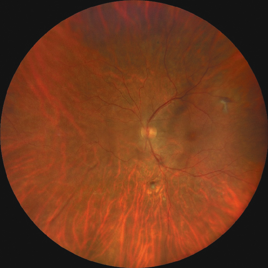 Из анамнеза известно, что пациент трижды перенес острое нарушение мозгового кровообращения (ОНМК). Впервые к офтальмологу обратился после третьего эпизода ОНМК, когда заметил резкое ухудшение, затуманивание зрения. Тогда был выставлен предварительный диагноз: «Болезнь Илза, субтотальный гемофтальм». Прошел курс консервативного лечения гемофтальма, после которого была выполнена фокальная лазерная коагуляция сетчатки. После лечения наблюдалось улучшение зрения со стабильным эффектом продолжительностью 6 месяцев, однако по прошествии данного периода пациент отмечает постепенное снижение зрения обоих глаз, искривление, нечеткость предметов перед левым глазом.