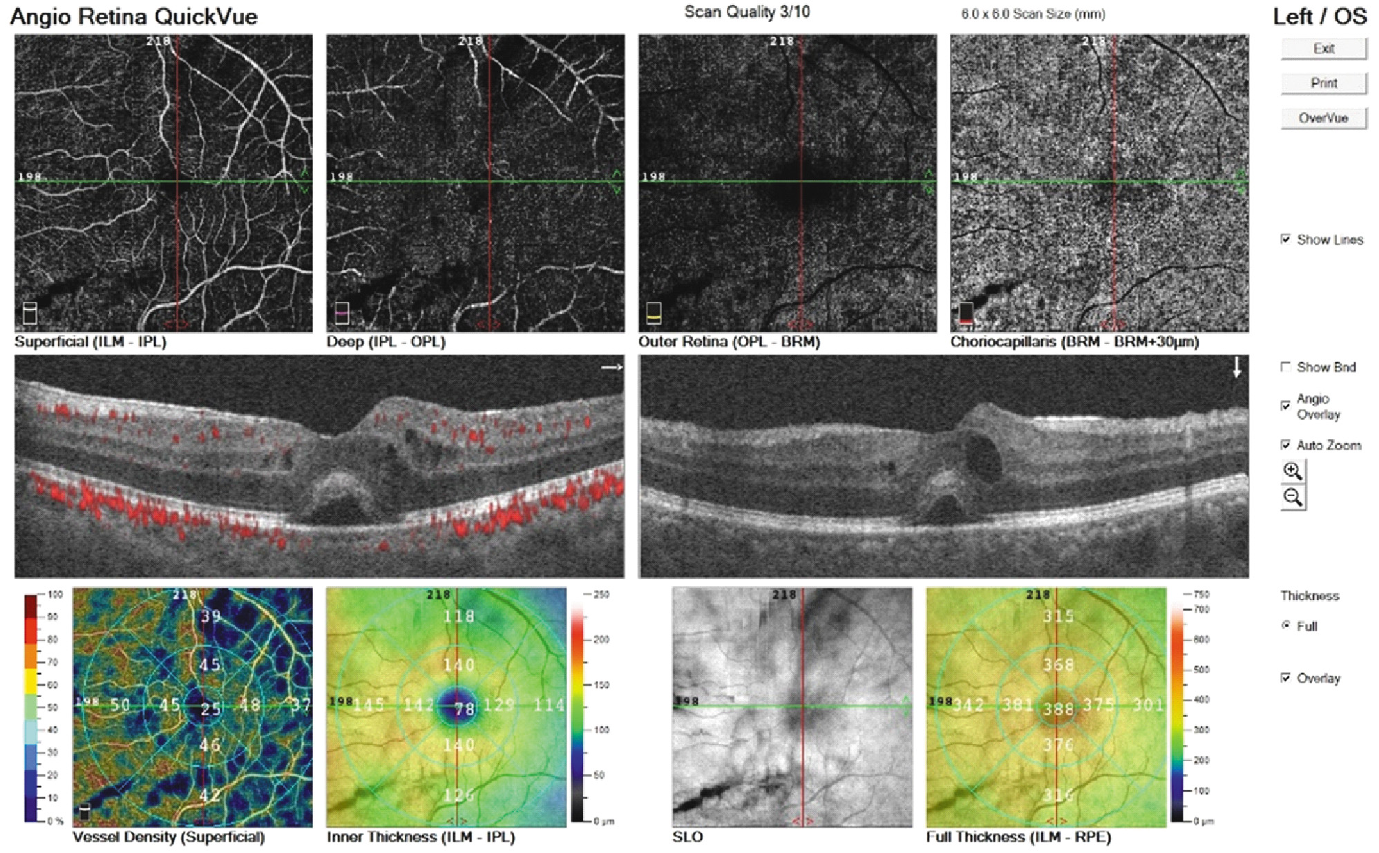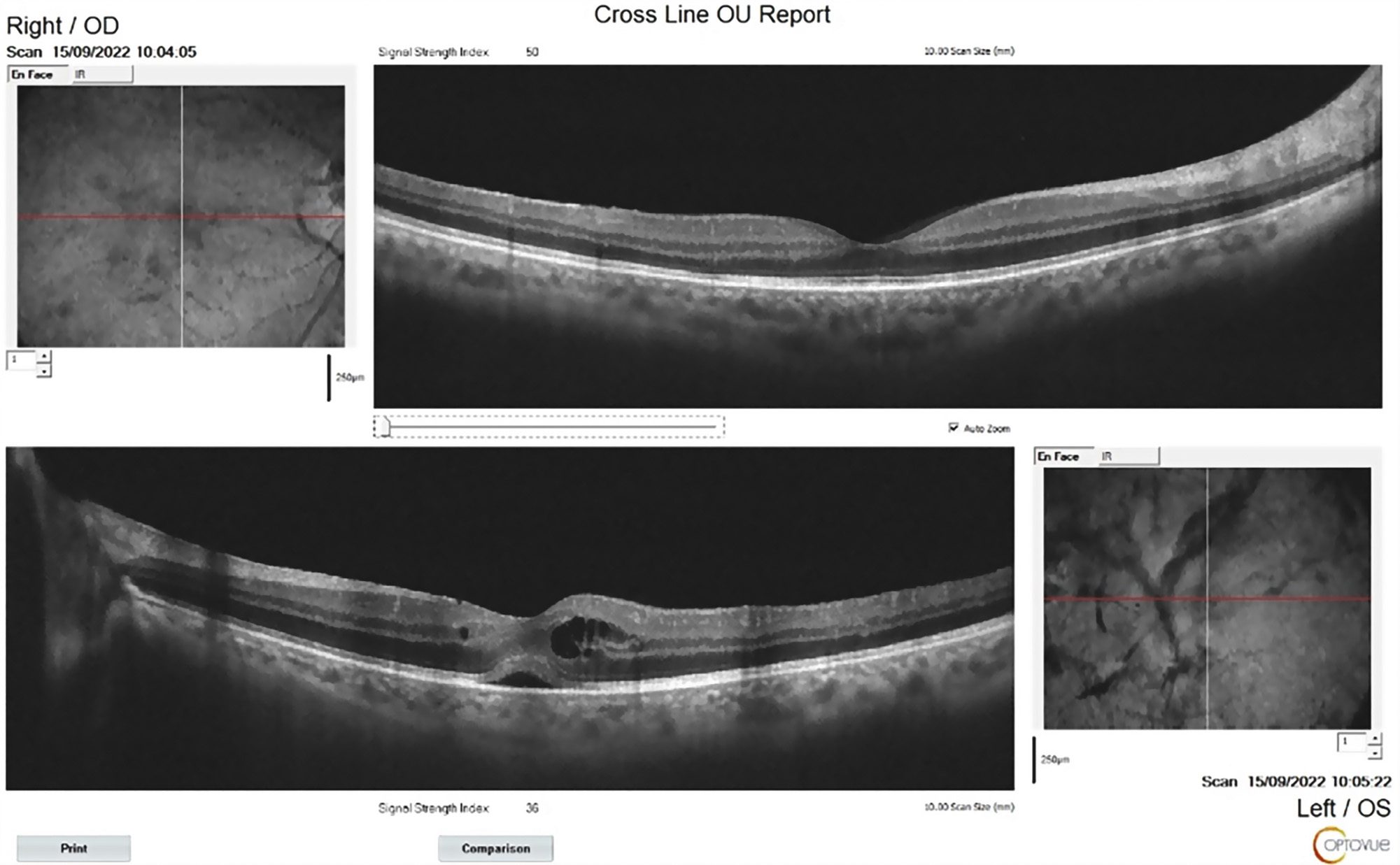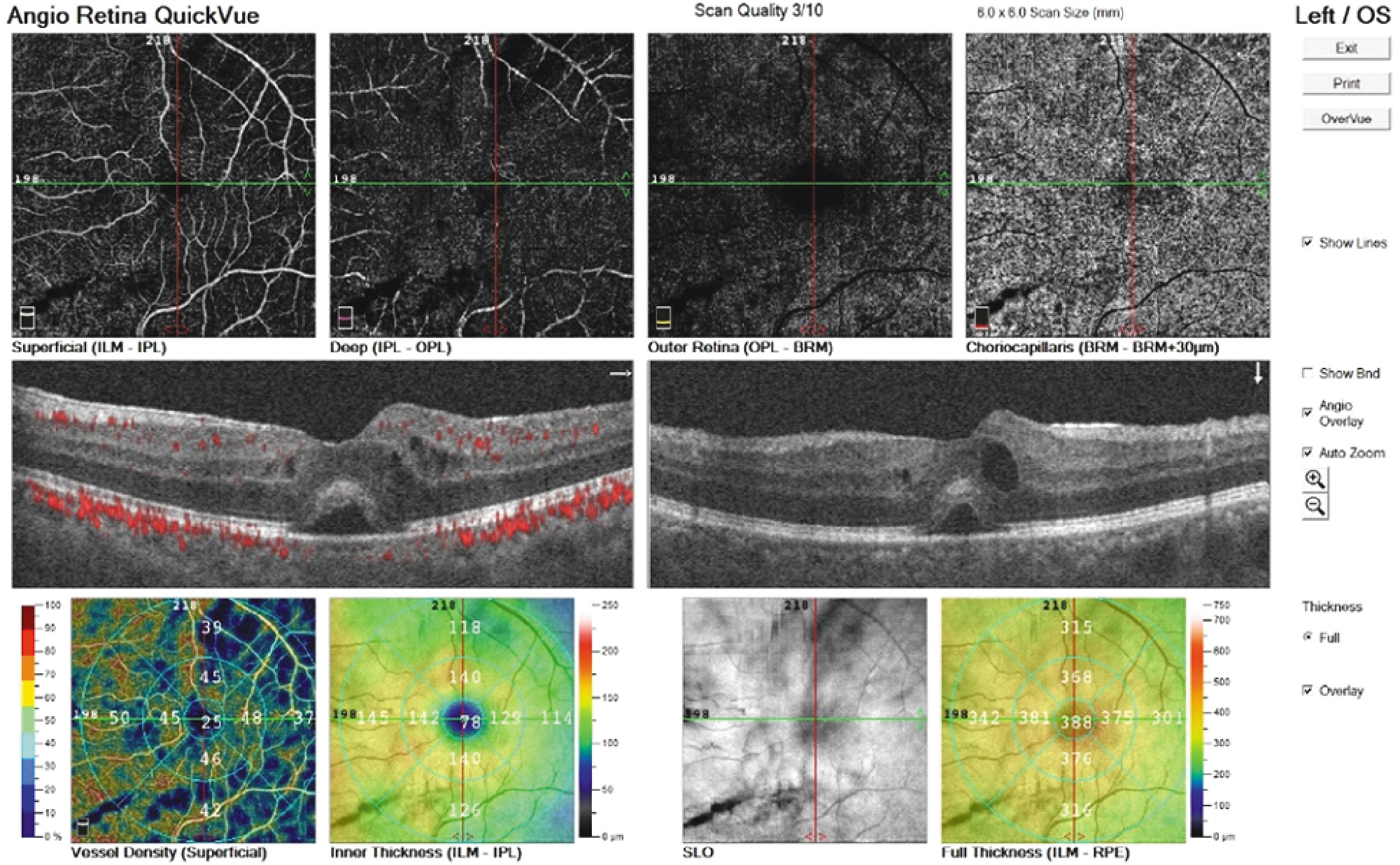 Оптическая когерентная томография (ОКТ) макулярной зоны правого глаза показала, что профиль центральной ямки сохранен, имеются зоны эпиретинального фиброза. По ОКТ макулярной зоны левого глаза диагностируется кистозный отек нейросенсорной сетчатки, отслойка нейроэпителия, эпиретинальный фиброз (рисунок 3).