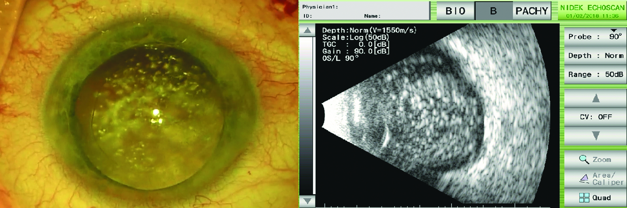 Figure 1. Asteroid hyalosis in a photograph and B-scan image