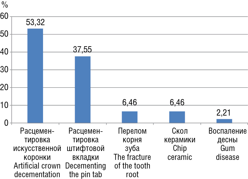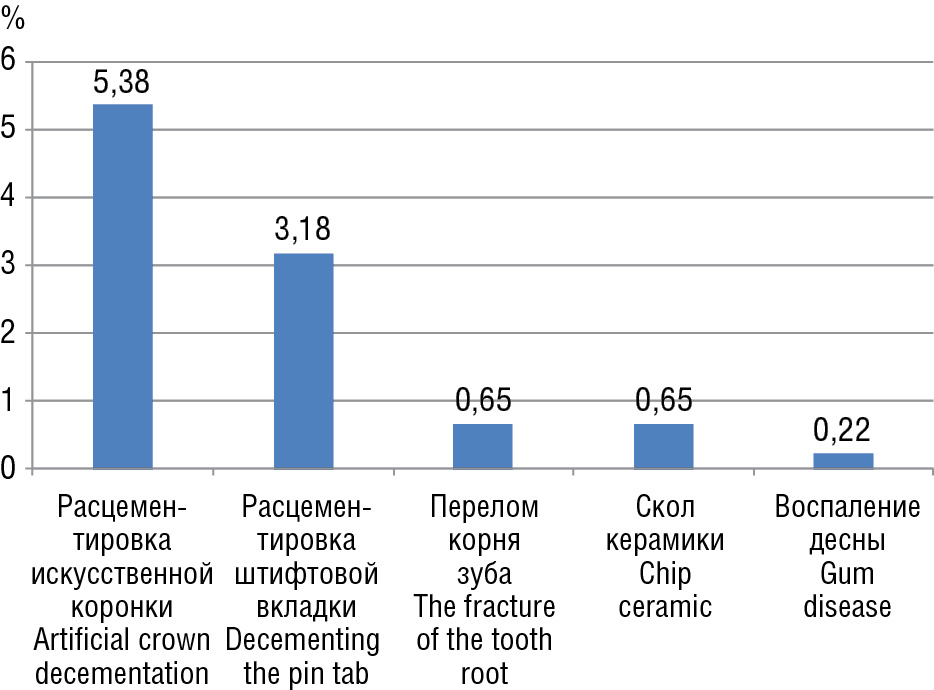 Results. Of the total number of patients (142,394 people), 5370 patients underwent a stump pin insert to restore a missing tooth crown. A total of 5802 pin stump tabs were made for these patients. 524 patients (10.09%) had complications. Most complications were observed in the lateral group of patients with prosthetic teeth (62.18%). Discementation of crowns from stump pin inserts was the main complication (53.32%). Ceramic crown chipping from metal-ceramic crowns was observed in 6.46% of all complications.