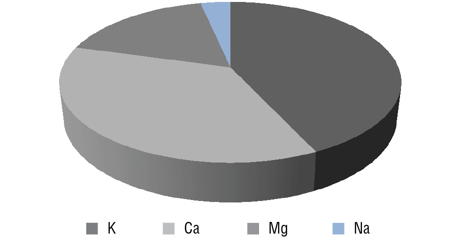 Результаты исследований количественного определения содержания микро- и макроэлементов в плодах овса посевного методом индуктивно связанной плазмы масс-спектрометрии представлены в таблице и на рисунке. Проведенный анализ изучения макро- и микроэлементов показал богатый элементный состав плодов овса посевного. В исследуемом сырье обнаружено 24 жизненно важных элемента, 4 из которых являются макроэлементами, 7 — микроэлементами и 16 — ультрамикроэлементами. Как видно из таблицы и рисунка, доминирующими в количественном соотношении являются калий, кальций, магний, натрий.