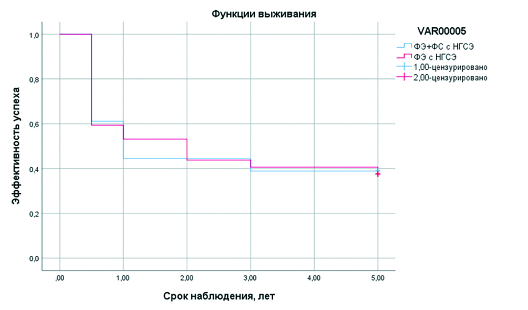 Для анализа доли пациентов, сохраняющих «полный» и «квалифицированный» успех после проведения хирургического лечения, был проведен анализ Каплана – Мейера, который наглядно демонстрирует более высокий процент пациентов, сохраняющих «полный» успех на протяжении пятилетнего срока наблюдения у пациентов после проведения ФЭ + ФС с НГСЭ – 40,7% по сравнению с группой ФС с НГСЭ – 36,7% (рисунок 1).