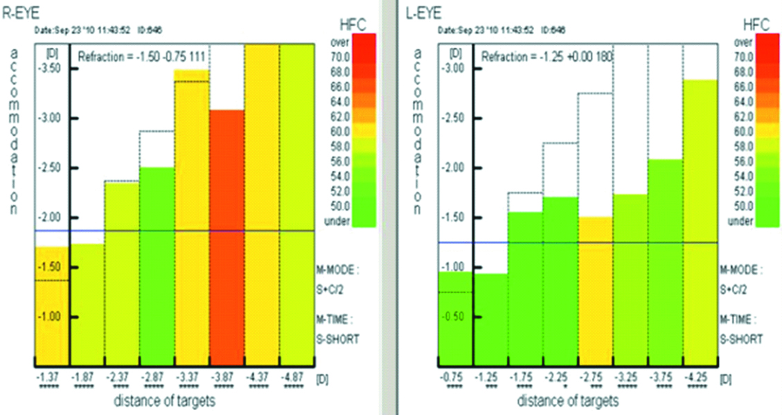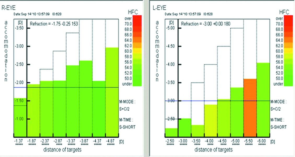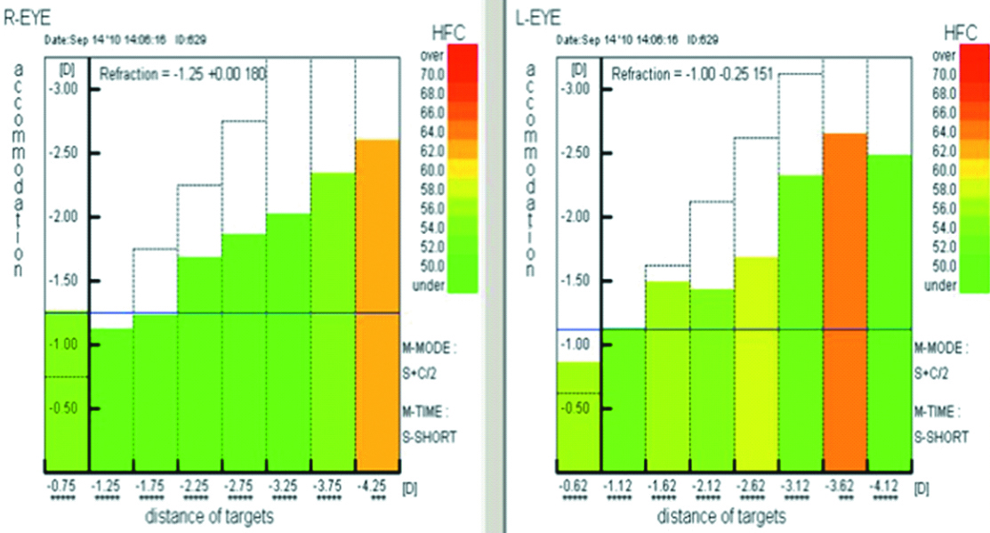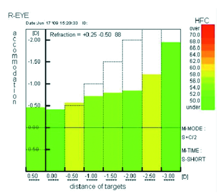 Исследование проведено на авторефрактометре с функцией аккомодографии Righton-Speedy K ver. MF-1. При работе прибора в режиме аккомодографии предъявляется зрительный стимул, имитирующий приставление к глазу отрицательных линз от 0,5 до 5,0 диоптрии с интервалом 0,5 диоптрии. Характер изменения рефракции глаза регистрируется на экране компьютера в виде столбиковой диаграммы, отражающей как количественное изменение рефракции глаза в процессе аккомодации, так и частоту аккомодационных микрофлуктуаций (АМФ) волокон цилиарной мышцы. Проводилась качественная и количественная оценка аккомодограмм. Для количественной характеристики использовались следующие показатели: коэффициент аккомодационного ответа (КАО), отражающий отношение величины аккомодационного ответа к величине аккомодационного стимула, и коэффициент микрофлуктуационный (КМФ), характеризующий среднюю частоту аккомодационных микрофлуктуаций [10]. В норме величина аккомодационного ответа составляет от половины до ¾ величины аккомодационного стимула (КАО от 0,5 до 0,7), она прогрессивно нарастает с увеличением оптической силы стимула. Физиологическая частота аккомодационных микрофлуктуаций (КМФ) колеблется в пределах от 50 до 62 микрофлуктуаций в минуту (мкф/мин.), что отражается на аккомодограмме зеленым и желтым цветом. Более высокая частота АМФ свидетельствует о спастическом сокращении волокон цилиарной мышцы и показана на аккомодограмме оранжевым и красным цветом. Классическая методика аккомодографии предусматривает монокулярное исследование без оптической коррекции. Пример нормальной аккомодограммы представлен на рисунке 1.