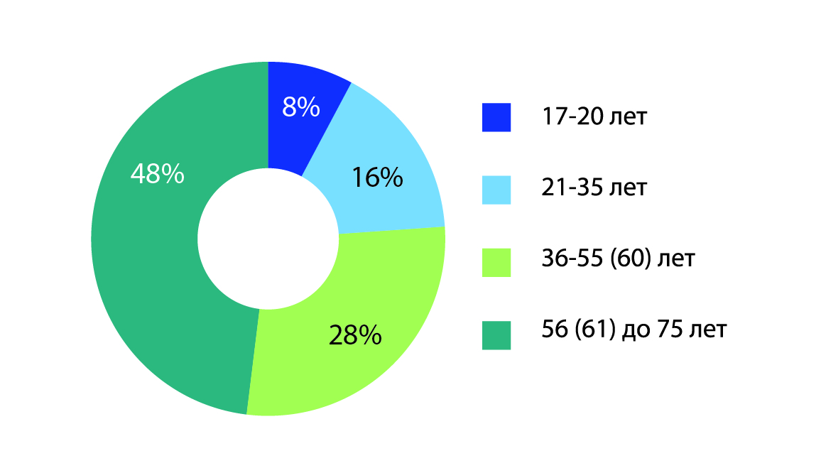 Таким образом, в возрасте от 17 до 20 лет было 2 пациента (8%), в группе 21–35 лет – 4 пациента (16%), 36–55 (60) лет – 7 пациентов (28%), от 56 лет женского пола и 61 года мужского пола до 75 лет включительно – 12 пациентов (48%).