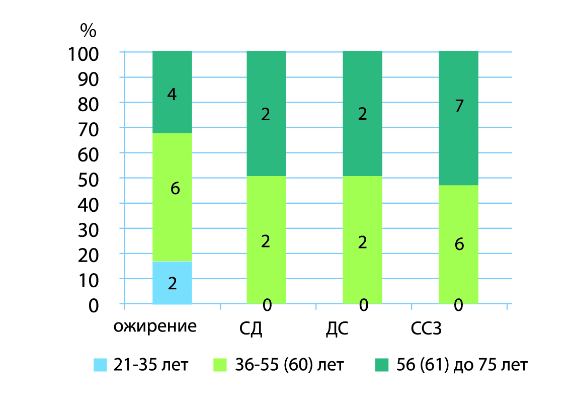 Средний возраст пациентов составил 51,4 года. Отмечается, что в группе лиц молодого и среднего возраста преобладают мужчины 58% (7 пациентов), в группе же пожилого возраста преобладали женщины 69% (8 пациентов). Наблюдение по возрасту в группах наблюдения представлено на рисунке 1.