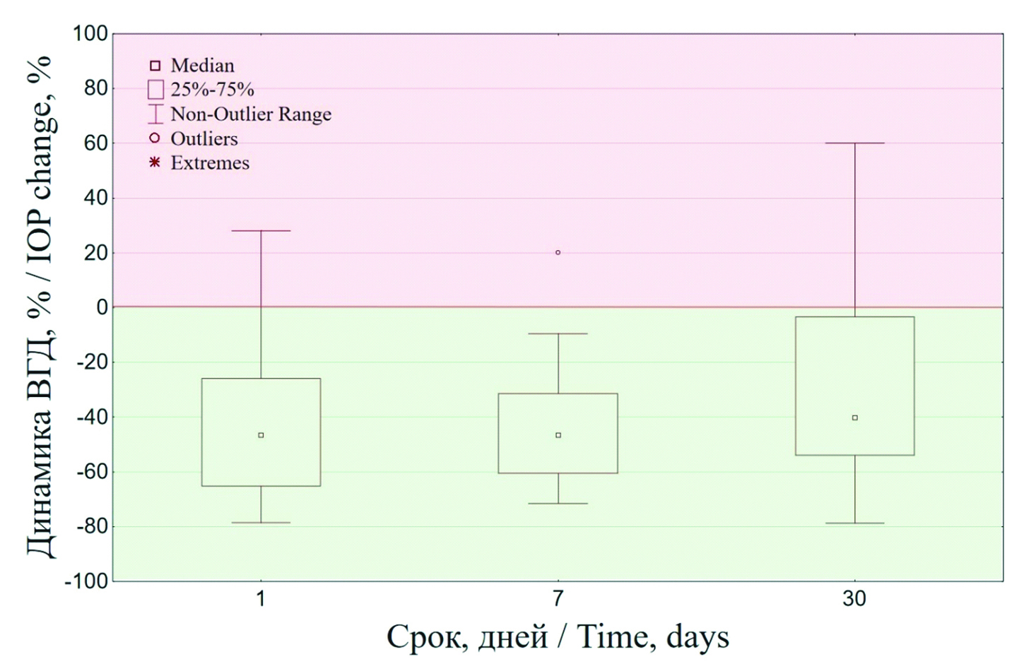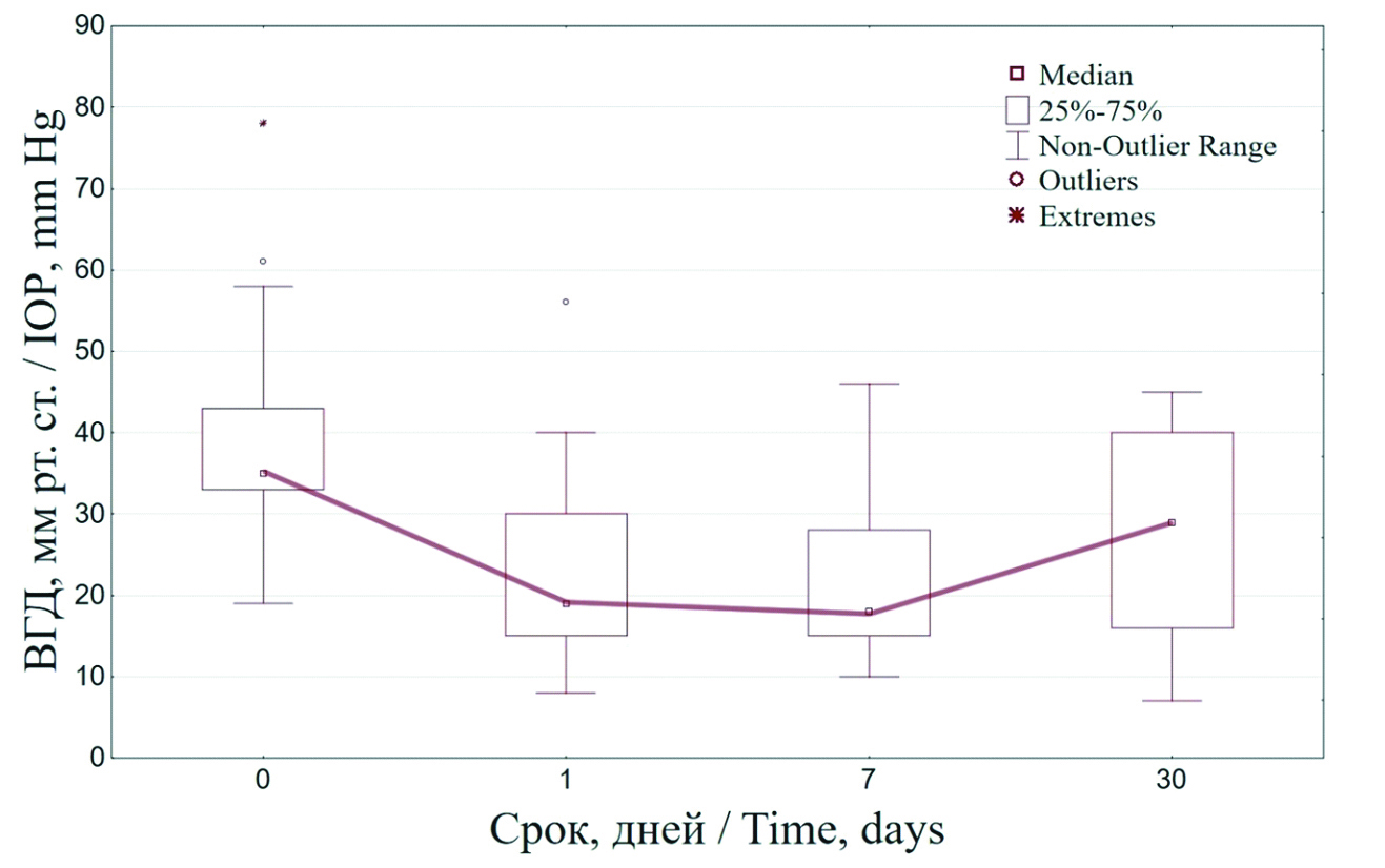 У большинства пациентов наблюдали снижение ВГД в сравнении с исходными значениями уже на следующий день после вмешательства (рисунки 1, 2), когда средние значения ВГД составили 19,0 (15,0; 30,0) мм рт. ст., а разница с исходным ВГД составила 17,0 (8,0; 27,0) мм рт. ст. (p = 0,0002). Через неделю уровень ВГД у исследуемых пациентов был равен 18,0 (15,0; 28,0) мм рт. ст., что меньше исходного ВГД на 18,0 (10,0; 26,0) мм рт. ст. (p = 0,0001). Через месяц наблюдали снижение гипотензивного эффекта у некоторых пациентов, и уровень ВГД составил 29,0 (16,0; 40,0) мм рт. ст., но тем не менее был достоверно ниже исходных значений на 18,0 (8,0; 33,0) мм рт. ст. (p = 0,0052).