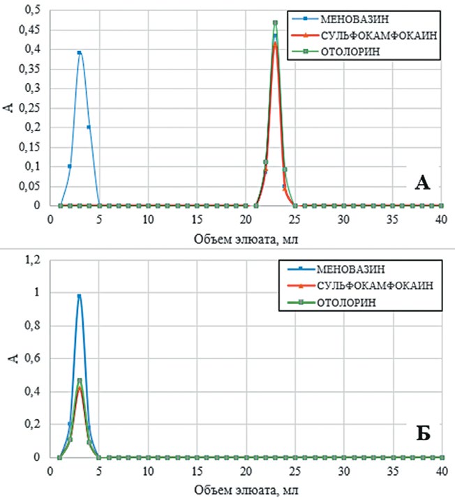 Рисунок 1. Хроматограммы лекарственных препаратов «Меновазин», «Сульфокамфокаин», «Отолорин» (ТФЭ с применением сорбента на основе гипромеллозы): ступенчатое элюирование последовательно водой очищенной и раствором кислоты хлористоводородной концентрации 0,1 моль/л (А); элюирование только раствором кислоты хлористоводородной концентрации 0,1 моль/л (Б).