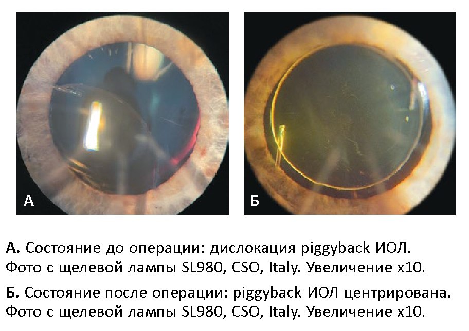 Основные сложности связаны с расчетом оптической силы интраокулярных линз, имплантируемых данной категории пациентов в ходе хирургии катаракты, поскольку даже новые формулы расчета ИОЛ третьего поколения не всегда дают оптимальный результат. Это неизбежно приводит к появлению пациентов с остаточными аметропиями (рефракционными ошибками). Для их коррекции существует несколько хирургических методов, в том числе послабляющие роговичные разрезы, замена ИОЛ, кераторефракционная лазерная хирургия, а также имплантация piggyback ИОЛ. Такая тактика становится частым выбором хирургов благодаря своей относительной простоте и безопасности, а также минимальному воздействию на роговицу [8]. Однако в тех случаях, когда происходит дислокация piggyback ИОЛ, как в представленном клиническом примере, выбор дальнейшей хирургической тактики представляет собой сложную задачу.