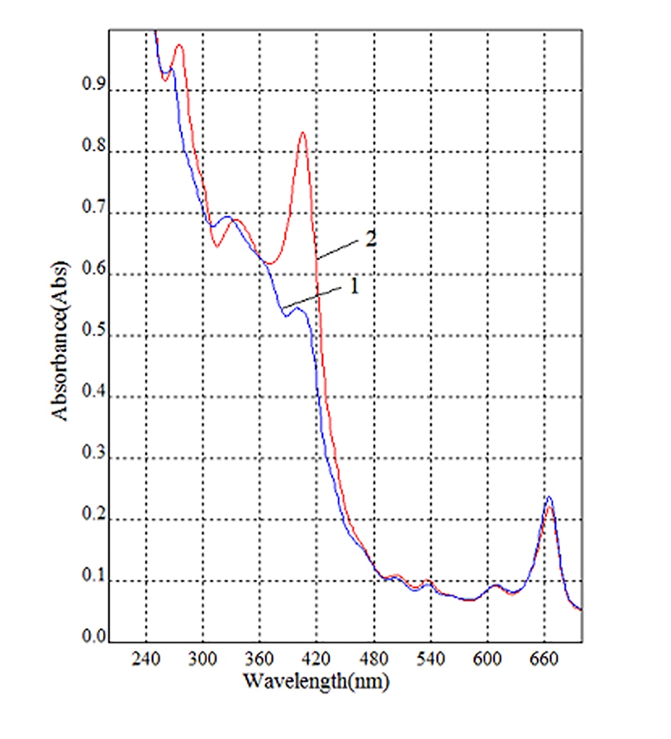 Figure 1. Electronic spectrum of water-alcohol extraction of bird's knotweed in a ratio of 1:50, using 50% ethyl alcohol. Designations: 1 – electronic spectrum of water-alcohol extraction of Polýgonum Aviculáre L.; 2 – electronic spectrum of water-alcohol extraction of avian highlander 3% AlCl3.