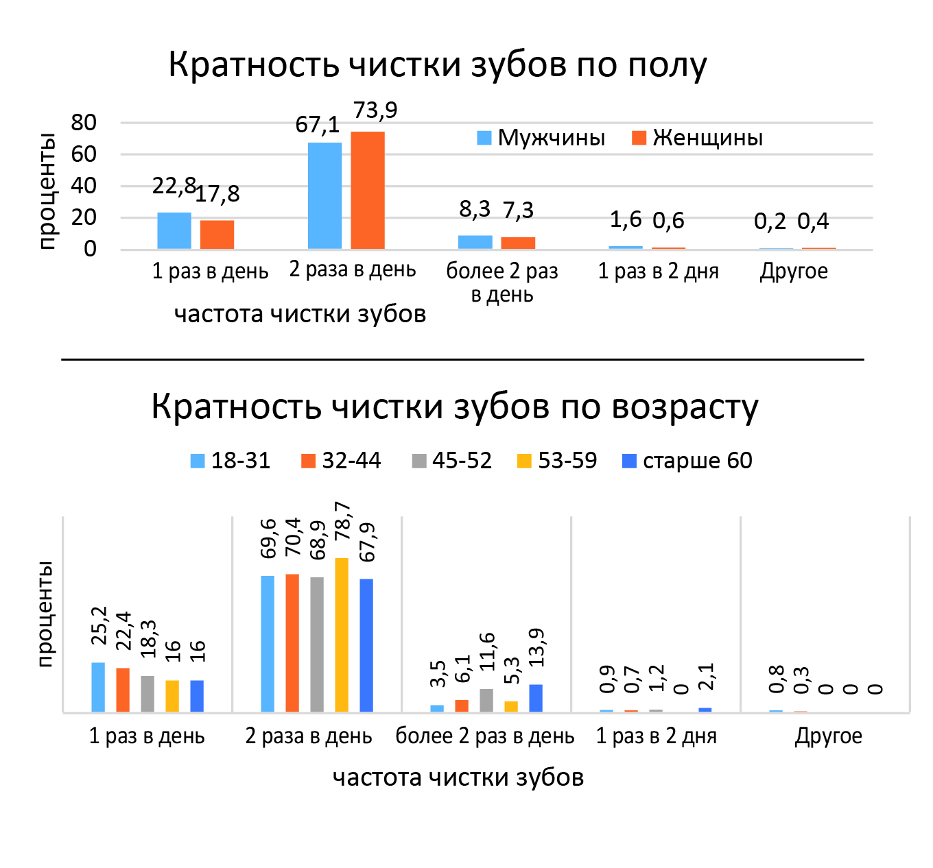 Рисунок 1. Распределение кратности чистки зубов по половозрастному признаку (в %).