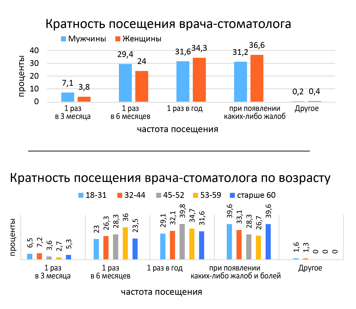 Оценка частоты посещений врача-стоматолога показала, что 34% участников анкетного опроса посещают врача-стоматолога два раз в год и более. Установлено, что значительная часть опрошенных людей посещают врача-стоматолога менее двух раз в год. В эту группу входят люди всех возрастных категорий с преобладанием людей в возрасте старше 60 лет (71,2%) и 45–52 лет (68,1%). Распределение ответов по полу и возрасту представлено на рисунке 2.