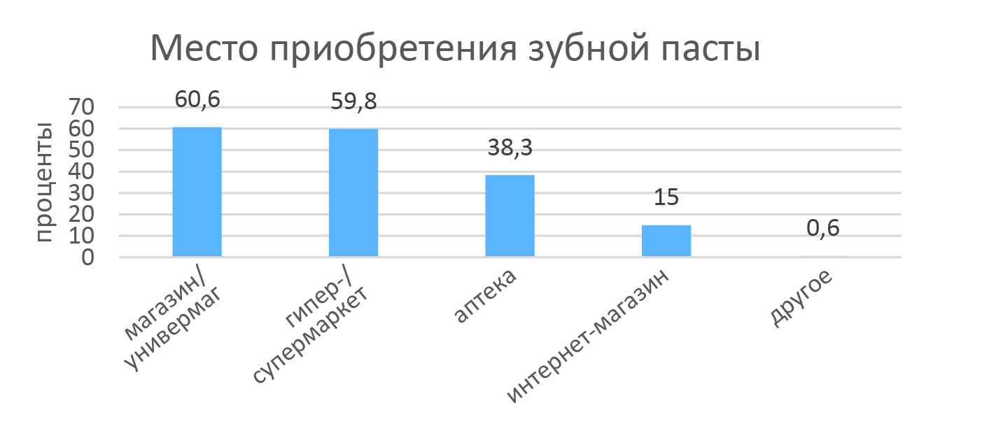Около 40% респондентов приобретают зубную пасту в аптеке, что обусловливает необходимость владения фармацевтическими специалистами достаточным объемом знаний о ее компонентах и их действии для оказания грамотного консультирования потребителей (рисунок 4).