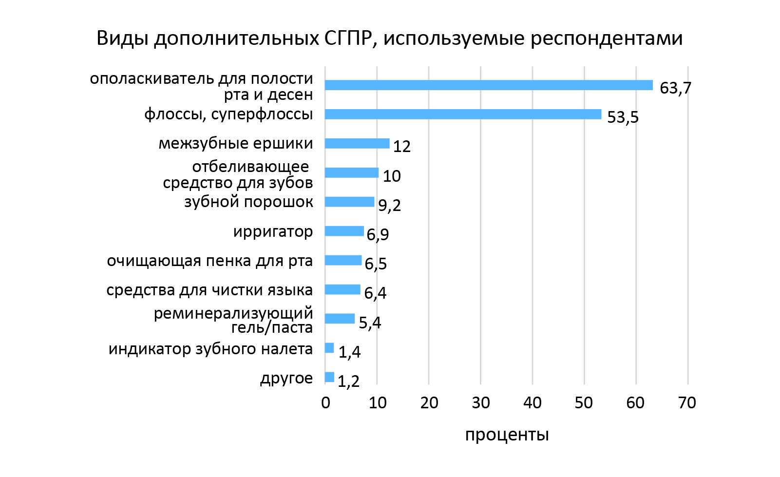 Результаты проведенного исследования свидетельствуют о том, что менее половины (48,4%) опрошенных респондентов использует дополнительные СГПР, из них 63,7% используют ополаскиватели для полости рта и десен и 53,5% – флоссы (рисунок 8).