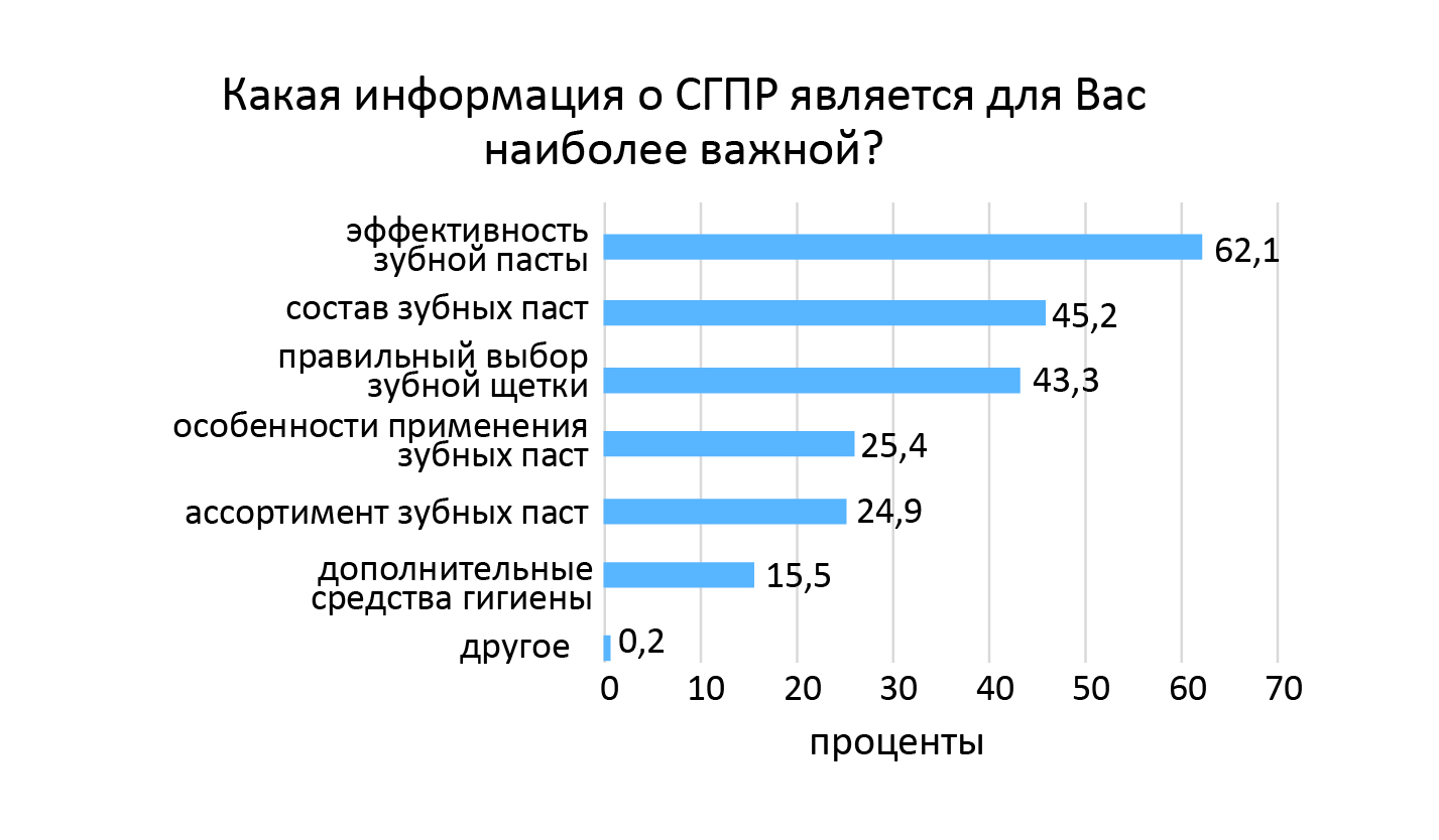 Приобретение СГПР в аптеках и выявленная информационная потребность респондентов свидетельствуют о том, что для оказания компетентного консультирования специалисту нужно владеть достаточными знаниями о компонентах зубных паст, дополнительных СГПР, их видах, а также особенностях индивидуального использования.