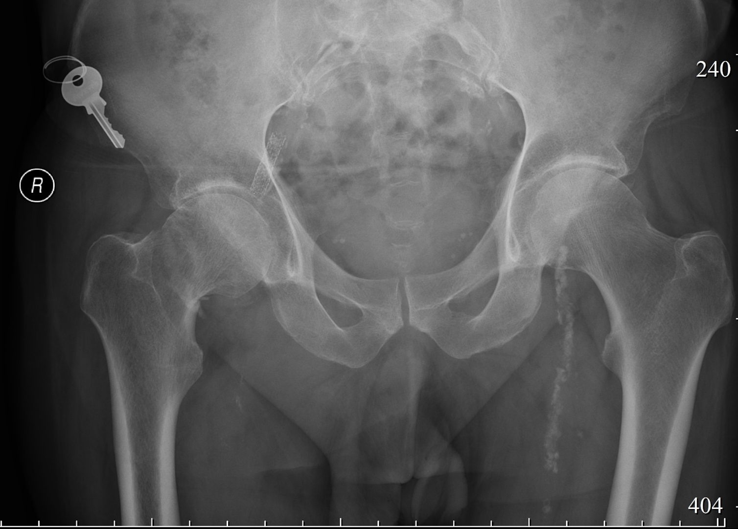 Больной З., 64 года, был доставлен бригадой скорой медицинской помощи в городскую клиническую больницу с жалобами на слабую боль в правом бедре и нарушением функции опоры. Пациент осмотрен травматологом и госпитализирован в травматологическое отделение. В соответствии с анамнезом травма была получена в результате падения на правое бедро. Больной обратился в центральную районную больницу по месту жительства, где ему была выполнена рентгенография правого тазобедренного сустава. На основании полученной рентгенограммы был диагностирован перелом шейки правого бедра со смещением отломков (рисунок 1).