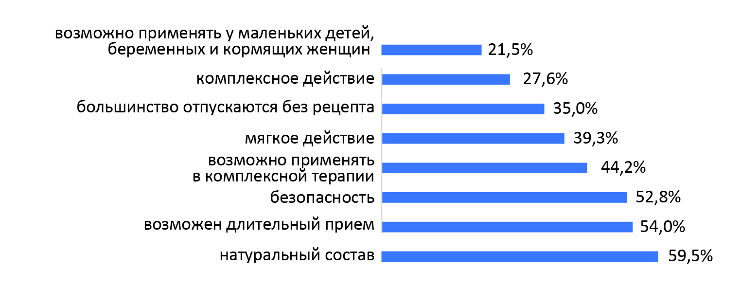 Больше половины всех опрошенных аптечных специалистов считают, что преимуществами РЛП перед синтетическими являются их натуральный состав, возможность длительного применения, безопасность (рисунок 1). В качестве преимущества 44,2% респондентов отметили также возможность использования фитопрепаратов в комплексной терапии.